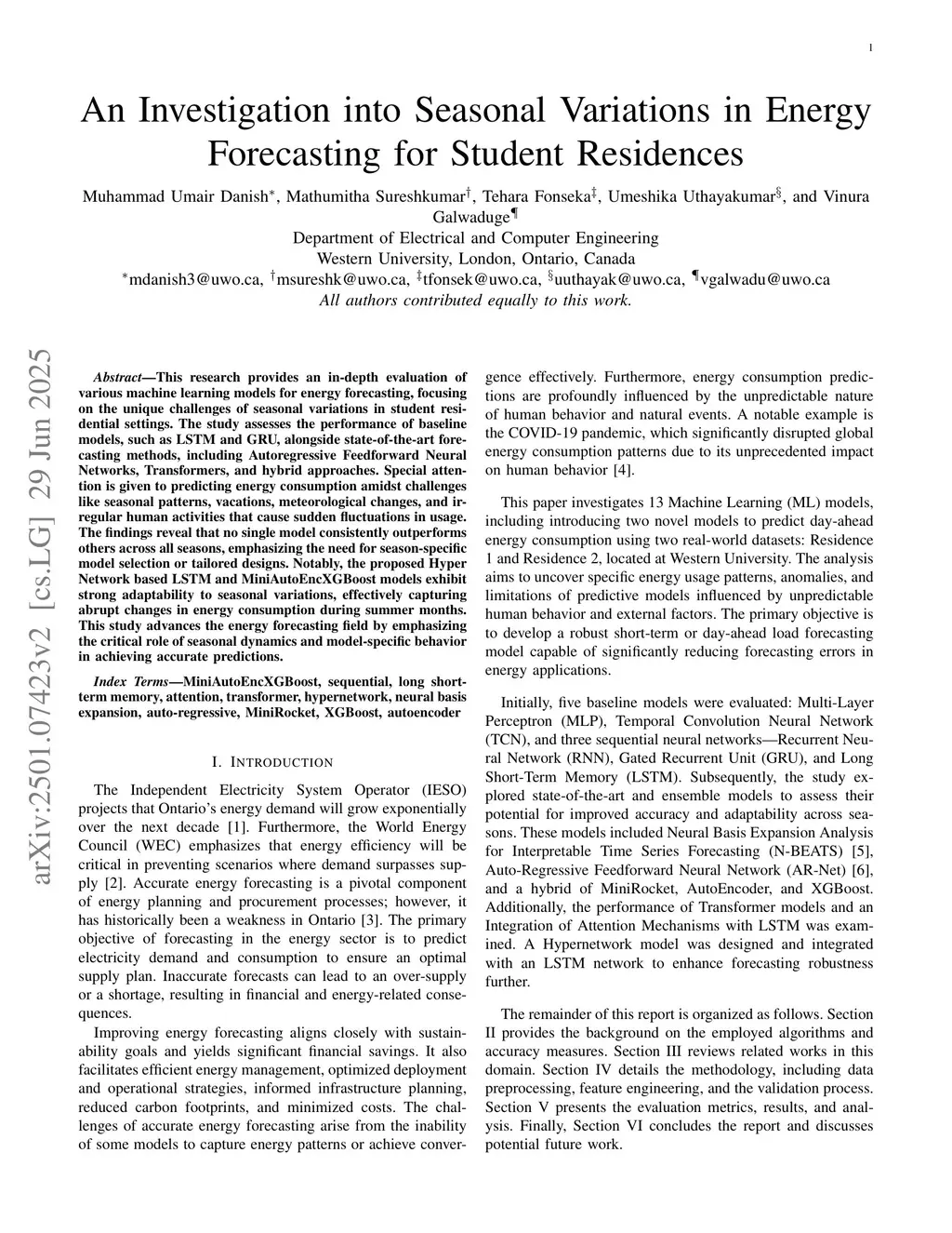 This research provides an in-depth evaluation of various machine learning models for energy forecasting, focusing on the unique challenges of seasonal variations in student residential settings. The study assesses the performance of baseline models, such as LSTM and GRU, alongside state-of-the-art forecasting methods, including Autoregressive Feedforward Neural Networks, Transformers, and hybrid approaches. Special attention is given to predicting energy consumption amidst challenges like seasonal patterns, vacations, meteorological changes, and irregular human activities that cause sudden fluctuations in usage. The findings reveal that no single model consistently outperforms others across all seasons, emphasizing the need for season-specific model selection or tailored designs. Notably, the proposed Hyper Network based LSTM and MiniAutoEncXGBoost models exhibit strong adaptability to seasonal variations, effectively capturing abrupt changes in energy consumption during summer months. This study advances the energy forecasting field by emphasizing the critical role of seasonal dynamics and model-specific behavior in achieving accurate predictions.