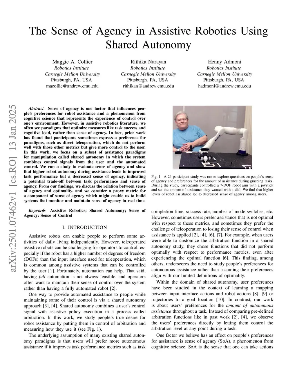 The Sense of Agency in Assistive Robotics Using Shared Autonomy