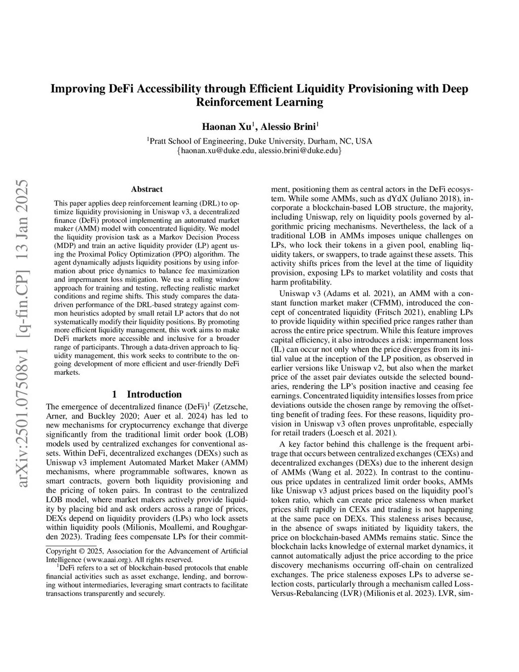 This paper applies deep reinforcement learning (DRL) to optimize liquidity provisioning in Uniswap v3, a decentralized finance (DeFi) protocol implementing an automated market maker (AMM) model with concentrated liquidity. We model the liquidity provision task as a Markov Decision Process (MDP) and train an active liquidity provider (LP) agent using the Proximal Policy Optimization (PPO) algorithm. The agent dynamically adjusts liquidity positions by using information about price dynamics to balance fee maximization and impermanent loss mitigation. We use a rolling window approach for training and testing, reflecting realistic market conditions and regime shifts. This study compares the data-driven performance of the DRL-based strategy against common heuristics adopted by small retail LP actors that do not systematically modify their liquidity positions. By promoting more efficient liquidity management, this work aims to make DeFi markets more accessible and inclusive for a broader range of participants. Through a data-driven approach to liquidity management, this work seeks to contribute to the ongoing development of more efficient and user-friendly DeFi markets.