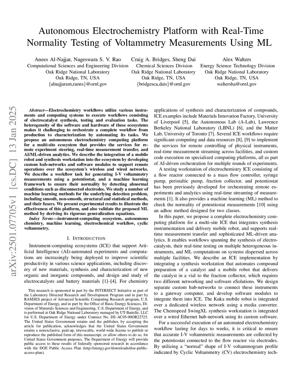 Electrochemistry workflows utilize various instruments and computing systems to execute workflows consisting of electrocatalyst synthesis, testing and evaluation tasks. The heterogeneity of the software and hardware of these ecosystems makes it challenging to orchestrate a complete workflow from production to characterization by automating its tasks. We propose an autonomous electrochemistry computing platform for a multi-site ecosystem that provides the services for remote experiment steering, real-time measurement transfer, and AI/ML-driven analytics. We describe the integration of a mobile robot and synthesis workstation into the ecosystem by developing custom hub-networks and software modules to support remote operations over the ecosystem's wireless and wired networks. We describe a workflow task for generating I-V voltammetry measurements using a potentiostat, and a machine learning framework to ensure their normality by detecting abnormal conditions such as disconnected electrodes. We study a number of machine learning methods for the underlying detection problem, including smooth, non-smooth, structural and statistical methods, and their fusers. We present experimental results to illustrate the effectiveness of this platform, and also validate the proposed ML method by deriving its rigorous generalization equations.
