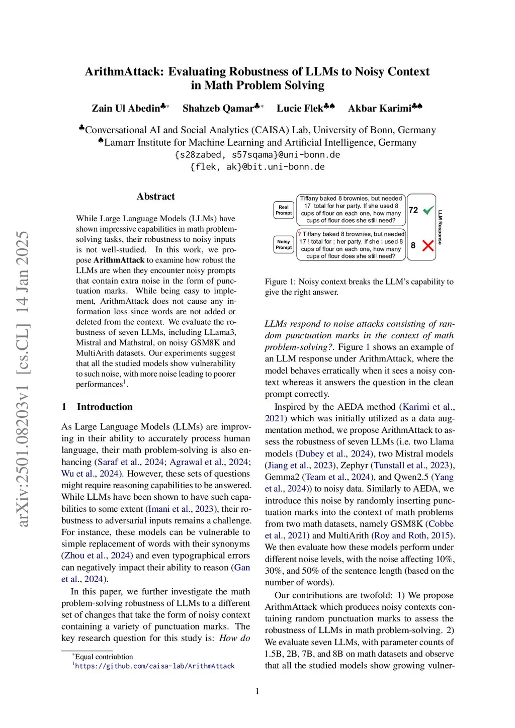 While Large Language Models (LLMs) have shown impressive capabilities in math problem-solving tasks, their robustness to noisy inputs is not well-studied. We propose ArithmAttack to examine how robust the LLMs are when they encounter noisy prompts that contain extra noise in the form of punctuation marks. While being easy to implement, ArithmAttack does not cause any information loss since words are not added or deleted from the context. We evaluate the robustness of eight LLMs, including LLama3, Mistral, Mathstral, and DeepSeek on noisy GSM8K and MultiArith datasets. Our experiments suggest that all the studied models show vulnerability to such noise, with more noise leading to poorer performances.