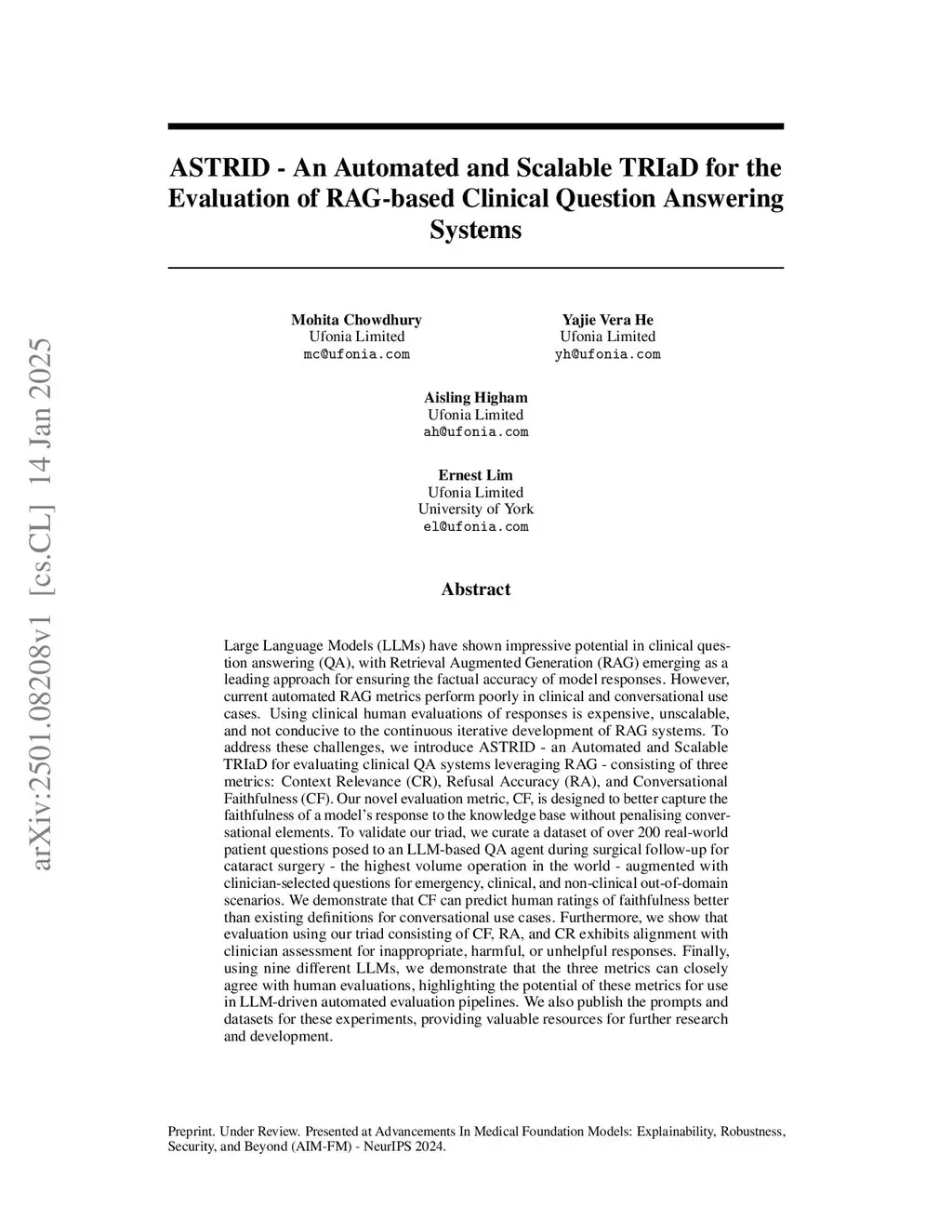 Large Language Models (LLMs) have shown impressive potential in clinical question answering (QA), with Retrieval Augmented Generation (RAG) emerging as a leading approach for ensuring the factual accuracy of model responses. However, current automated RAG metrics perform poorly in clinical and conversational use cases. Using clinical human evaluations of responses is expensive, unscalable, and not conducive to the continuous iterative development of RAG systems. To address these challenges, we introduce ASTRID - an Automated and Scalable TRIaD for evaluating clinical QA systems leveraging RAG - consisting of three metrics: Context Relevance (CR), Refusal Accuracy (RA), and Conversational Faithfulness (CF). Our novel evaluation metric, CF, is designed to better capture the faithfulness of a model's response to the knowledge base without penalising conversational elements. To validate our triad, we curate a dataset of over 200 real-world patient questions posed to an LLM-based QA agent during surgical follow-up for cataract surgery - the highest volume operation in the world - augmented with clinician-selected questions for emergency, clinical, and non-clinical out-of-domain scenarios. We demonstrate that CF can predict human ratings of faithfulness better than existing definitions for conversational use cases. Furthermore, we show that evaluation using our triad consisting of CF, RA, and CR exhibits alignment with clinician assessment for inappropriate, harmful, or unhelpful responses. Finally, using nine different LLMs, we demonstrate that the three metrics can closely agree with human evaluations, highlighting the potential of these metrics for use in LLM-driven automated evaluation pipelines. We also publish the prompts and datasets for these experiments, providing valuable resources for further research and development.