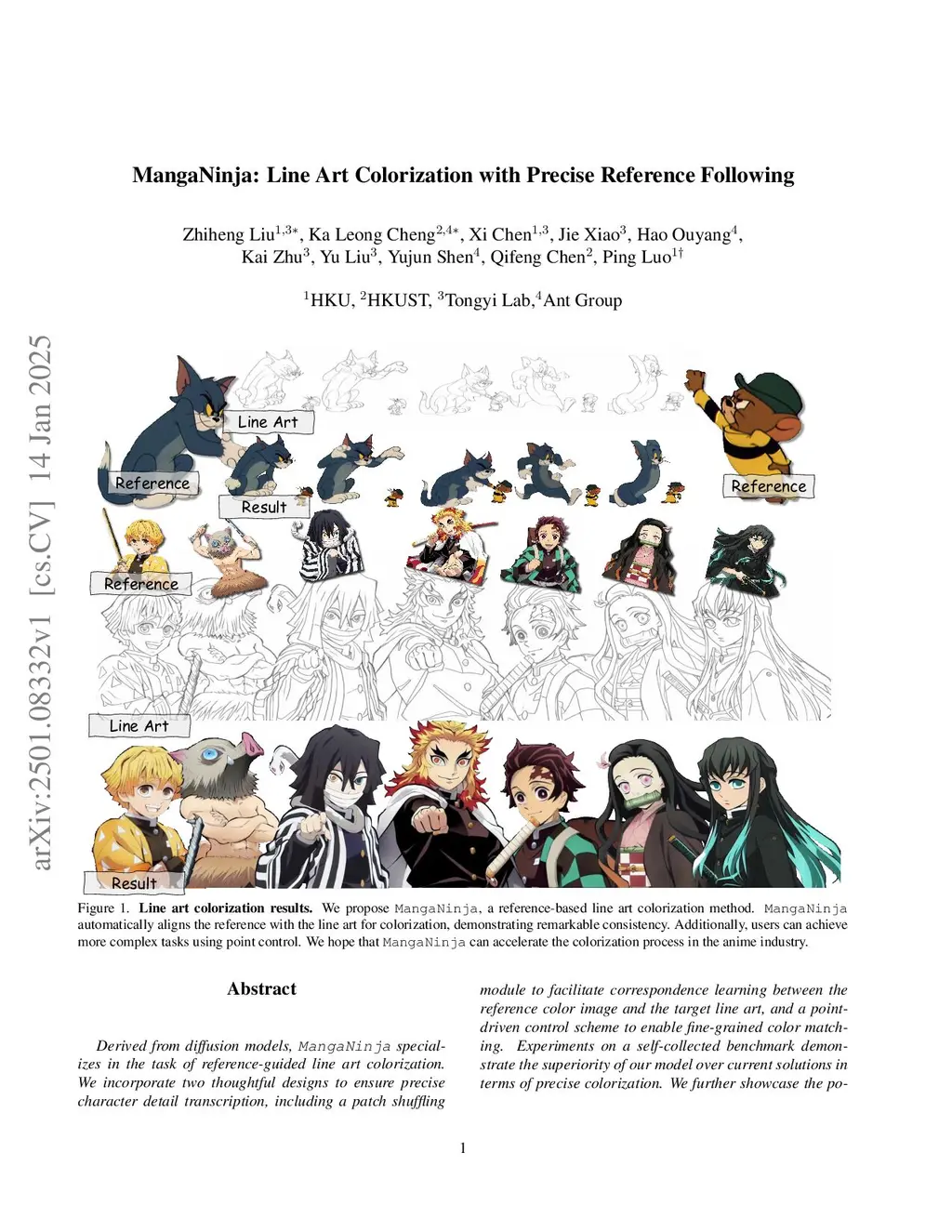 Derived from diffusion models, MangaNinjia specializes in the task of reference-guided line art colorization. We incorporate two thoughtful designs to ensure precise character detail transcription, including a patch shuffling module to facilitate correspondence learning between the reference color image and the target line art, and a point-driven control scheme to enable fine-grained color matching. Experiments on a self-collected benchmark demonstrate the superiority of our model over current solutions in terms of precise colorization. We further showcase the potential of the proposed interactive point control in handling challenging cases, cross-character colorization, multi-reference harmonization, beyond the reach of existing algorithms.