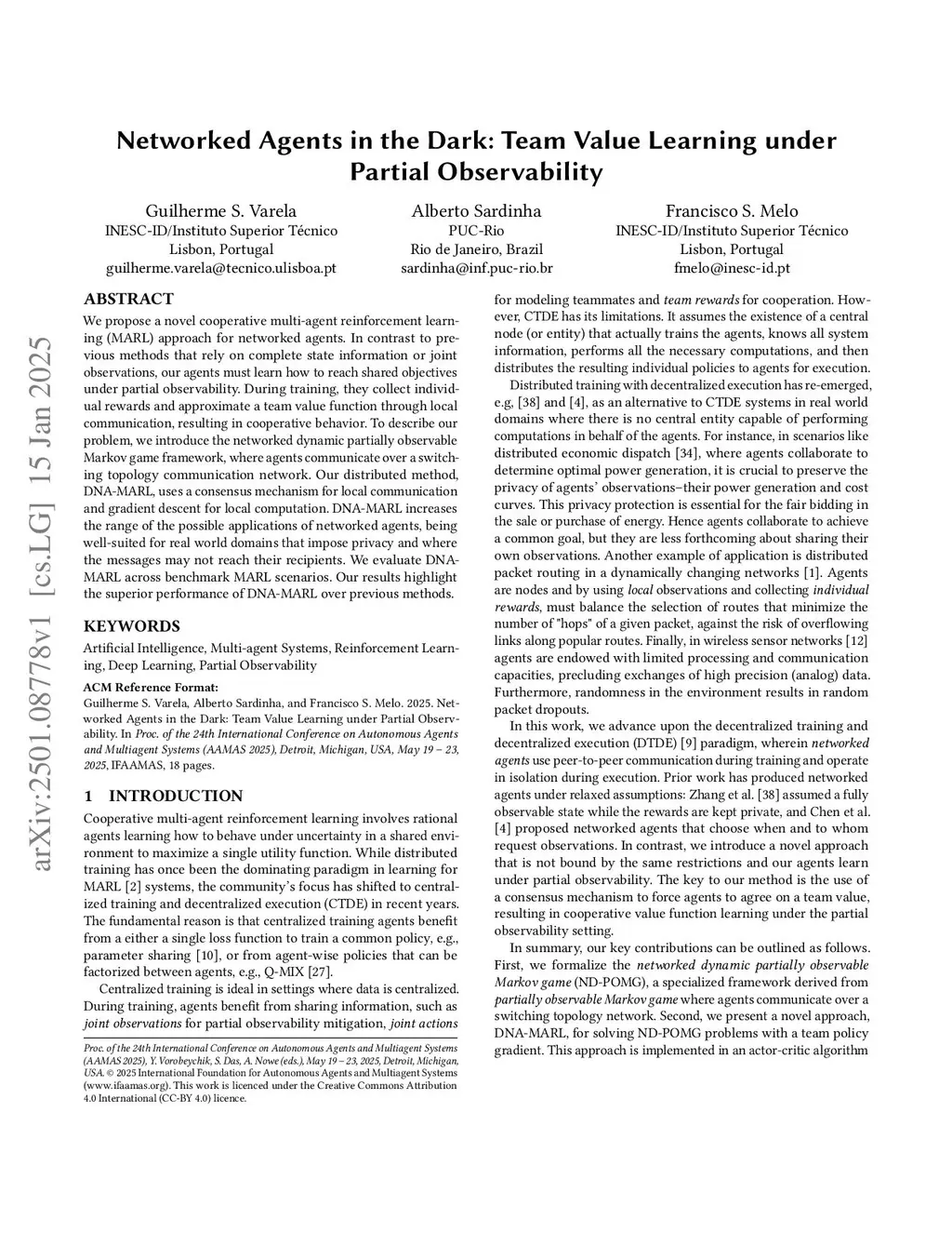 We propose a novel cooperative multi-agent reinforcement learning (MARL) approach for networked agents. In contrast to previous methods that rely on complete state information or joint observations, our agents must learn how to reach shared objectives under partial observability. During training, they collect individual rewards and approximate a team value function through local communication, resulting in cooperative behavior. To describe our problem, we introduce the networked dynamic partially observable Markov game framework, where agents communicate over a switching topology communication network. Our distributed method, DNA-MARL, uses a consensus mechanism for local communication and gradient descent for local computation. DNA-MARL increases the range of the possible applications of networked agents, being well-suited for real world domains that impose privacy and where the messages may not reach their recipients. We evaluate DNA-MARL across benchmark MARL scenarios. Our results highlight the superior performance of DNA-MARL over previous methods.