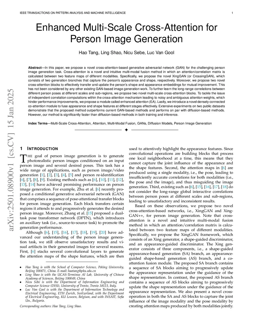 In this paper, we propose a novel cross-attention-based generative adversarial network (GAN) for the challenging person image generation task. Cross-attention is a novel and intuitive multi-modal fusion method in which an attention/correlation matrix is calculated between two feature maps of different modalities. Specifically, we propose the novel XingGAN (or CrossingGAN), which consists of two generation branches that capture the person's appearance and shape, respectively. Moreover, we propose two novel cross-attention blocks to effectively transfer and update the person's shape and appearance embeddings for mutual improvement. This has not been considered by any other existing GAN-based image generation work. To further learn the long-range correlations between different person poses at different scales and sub-regions, we propose two novel multi-scale cross-attention blocks. To tackle the issue of independent correlation computations within the cross-attention mechanism leading to noisy and ambiguous attention weights, which hinder performance improvements, we propose a module called enhanced attention (EA). Lastly, we introduce a novel densely connected co-attention module to fuse appearance and shape features at different stages effectively. Extensive experiments on two public datasets demonstrate that the proposed method outperforms current GAN-based methods and performs on par with diffusion-based methods. However, our method is significantly faster than diffusion-based methods in both training and inference.