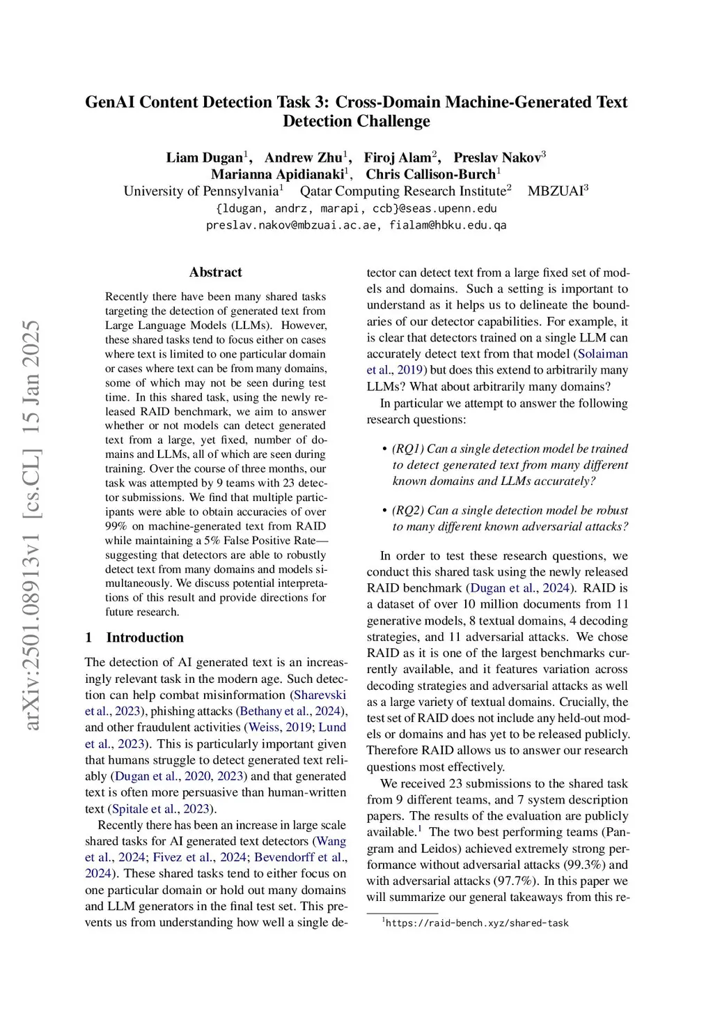 Recently there have been many shared tasks targeting the detection of generated text from Large Language Models (LLMs). However, these shared tasks tend to focus either on cases where text is limited to one particular domain or cases where text can be from many domains, some of which may not be seen during test time. In this shared task, using the newly released RAID benchmark, we aim to answer whether or not models can detect generated text from a large, yet fixed, number of domains and LLMs, all of which are seen during training. Over the course of three months, our task was attempted by 9 teams with 23 detector submissions. We find that multiple participants were able to obtain accuracies of over 99% on machine-generated text from RAID while maintaining a 5% False Positive Rate -- suggesting that detectors are able to robustly detect text from many domains and models simultaneously. We discuss potential interpretations of this result and provide directions for future research.