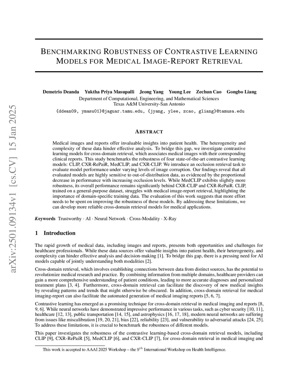 Medical images and reports offer invaluable insights into patient health. The heterogeneity and complexity of these data hinder effective analysis. To bridge this gap, we investigate contrastive learning models for cross-domain retrieval, which associates medical images with their corresponding clinical reports. This study benchmarks the robustness of four state-of-the-art contrastive learning models: CLIP, CXR-RePaiR, MedCLIP, and CXR-CLIP. We introduce an occlusion retrieval task to evaluate model performance under varying levels of image corruption. Our findings reveal that all evaluated models are highly sensitive to out-of-distribution data, as evidenced by the proportional decrease in performance with increasing occlusion levels. While MedCLIP exhibits slightly more robustness, its overall performance remains significantly behind CXR-CLIP and CXR-RePaiR. CLIP, trained on a general-purpose dataset, struggles with medical image-report retrieval, highlighting the importance of domain-specific training data. The evaluation of this work suggests that more effort needs to be spent on improving the robustness of these models. By addressing these limitations, we can develop more reliable cross-domain retrieval models for medical applications.