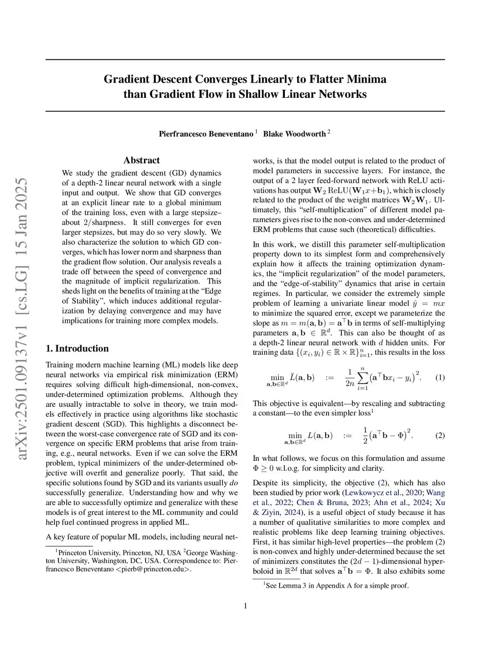 Gradient Descent Converges Linearly to Flatter Minima than Gradient Flow in Shallow Linear Networks