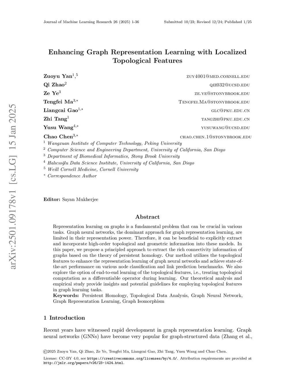 Representation learning on graphs is a fundamental problem that can be crucial in various tasks. Graph neural networks, the dominant approach for graph representation learning, are limited in their representation power. Therefore, it can be beneficial to explicitly extract and incorporate high-order topological and geometric information into these models. In this paper, we propose a principled approach to extract the rich connectivity information of graphs based on the theory of persistent homology. Our method utilizes the topological features to enhance the representation learning of graph neural networks and achieve state-of-the-art performance on various node classification and link prediction benchmarks. We also explore the option of end-to-end learning of the topological features, i.e., treating topological computation as a differentiable operator during learning. Our theoretical analysis and empirical study provide insights and potential guidelines for employing topological features in graph learning tasks.