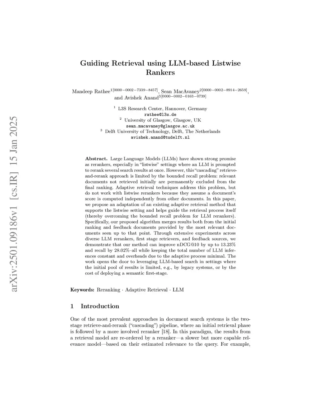 Large Language Models (LLMs) have shown strong promise as rerankers, especially in ``listwise'' settings where an LLM is prompted to rerank several search results at once. However, this ``cascading'' retrieve-and-rerank approach is limited by the bounded recall problem: relevant documents not retrieved initially are permanently excluded from the final ranking. Adaptive retrieval techniques address this problem, but do not work with listwise rerankers because they assume a document's score is computed independently from other documents. In this paper, we propose an adaptation of an existing adaptive retrieval method that supports the listwise setting and helps guide the retrieval process itself (thereby overcoming the bounded recall problem for LLM rerankers). Specifically, our proposed algorithm merges results both from the initial ranking and feedback documents provided by the most relevant documents seen up to that point. Through extensive experiments across diverse LLM rerankers, first stage retrievers, and feedback sources, we demonstrate that our method can improve nDCG@10 by up to 13.23% and recall by 28.02%--all while keeping the total number of LLM inferences constant and overheads due to the adaptive process minimal. The work opens the door to leveraging LLM-based search in settings where the initial pool of results is limited, e.g., by legacy systems, or by the cost of deploying a semantic first-stage.