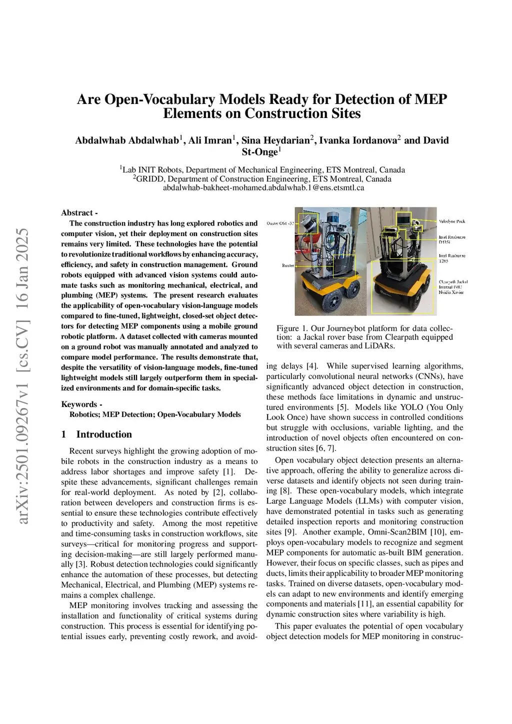 The construction industry has long explored robotics and computer vision, yet their deployment on construction sites remains very limited. These technologies have the potential to revolutionize traditional workflows by enhancing accuracy, efficiency, and safety in construction management. Ground robots equipped with advanced vision systems could automate tasks such as monitoring mechanical, electrical, and plumbing (MEP) systems. The present research evaluates the applicability of open-vocabulary vision-language models compared to fine-tuned, lightweight, closed-set object detectors for detecting MEP components using a mobile ground robotic platform. A dataset collected with cameras mounted on a ground robot was manually annotated and analyzed to compare model performance. The results demonstrate that, despite the versatility of vision-language models, fine-tuned lightweight models still largely outperform them in specialized environments and for domain-specific tasks.