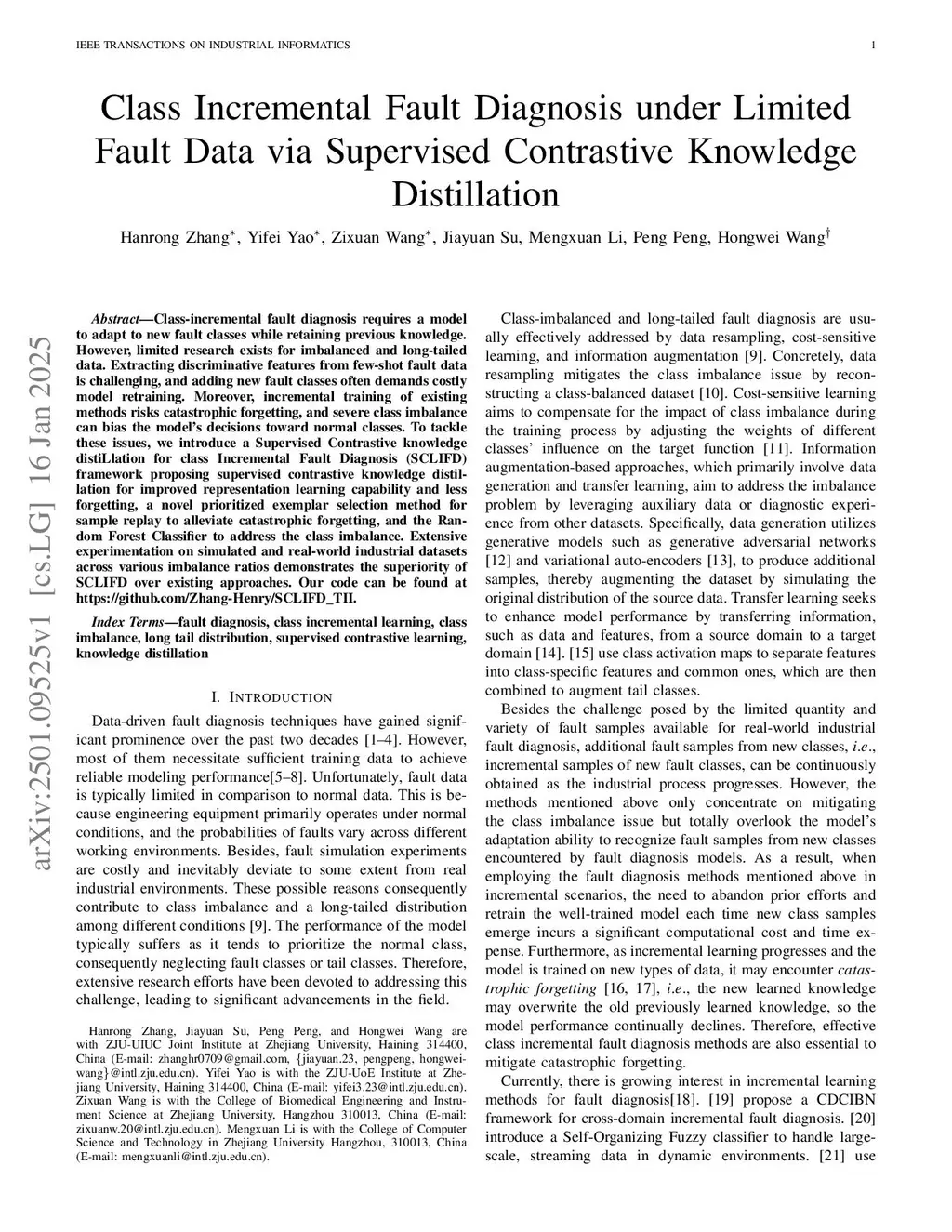 Class-incremental fault diagnosis requires a model to adapt to new fault classes while retaining previous knowledge. However, limited research exists for imbalanced and long-tailed data. Extracting discriminative features from few-shot fault data is challenging, and adding new fault classes often demands costly model retraining. Moreover, incremental training of existing methods risks catastrophic forgetting, and severe class imbalance can bias the model's decisions toward normal classes. To tackle these issues, we introduce a Supervised Contrastive knowledge distiLlation for class Incremental Fault Diagnosis (SCLIFD) framework proposing supervised contrastive knowledge distillation for improved representation learning capability and less forgetting, a novel prioritized exemplar selection method for sample replay to alleviate catastrophic forgetting, and the Random Forest Classifier to address the class imbalance. Extensive experimentation on simulated and real-world industrial datasets across various imbalance ratios demonstrates the superiority of SCLIFD over existing approaches. Our code can be found atthis https URL.