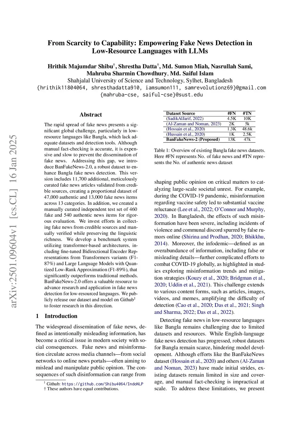 The rapid spread of fake news presents a significant global challenge, particularly in low-resource languages like Bangla, which lack adequate datasets and detection tools. Although manual fact-checking is accurate, it is expensive and slow to prevent the dissemination of fake news. Addressing this gap, we introduce BanFakeNews-2.0, a robust dataset to enhance Bangla fake news detection. This version includes 11,700 additional, meticulously curated fake news articles validated from credible sources, creating a proportional dataset of 47,000 authentic and 13,000 fake news items across 13 categories. In addition, we created a manually curated independent test set of 460 fake and 540 authentic news items for rigorous evaluation. We invest efforts in collecting fake news from credible sources and manually verified while preserving the linguistic richness. We develop a benchmark system utilizing transformer-based architectures, including fine-tuned Bidirectional Encoder Representations from Transformers variants (F1-87\%) and Large Language Models with Quantized Low-Rank Approximation (F1-89\%), that significantly outperforms traditional methods. BanFakeNews-2.0 offers a valuable resource to advance research and application in fake news detection for low-resourced languages. We publicly release our dataset and model on Github to foster research in this direction.
