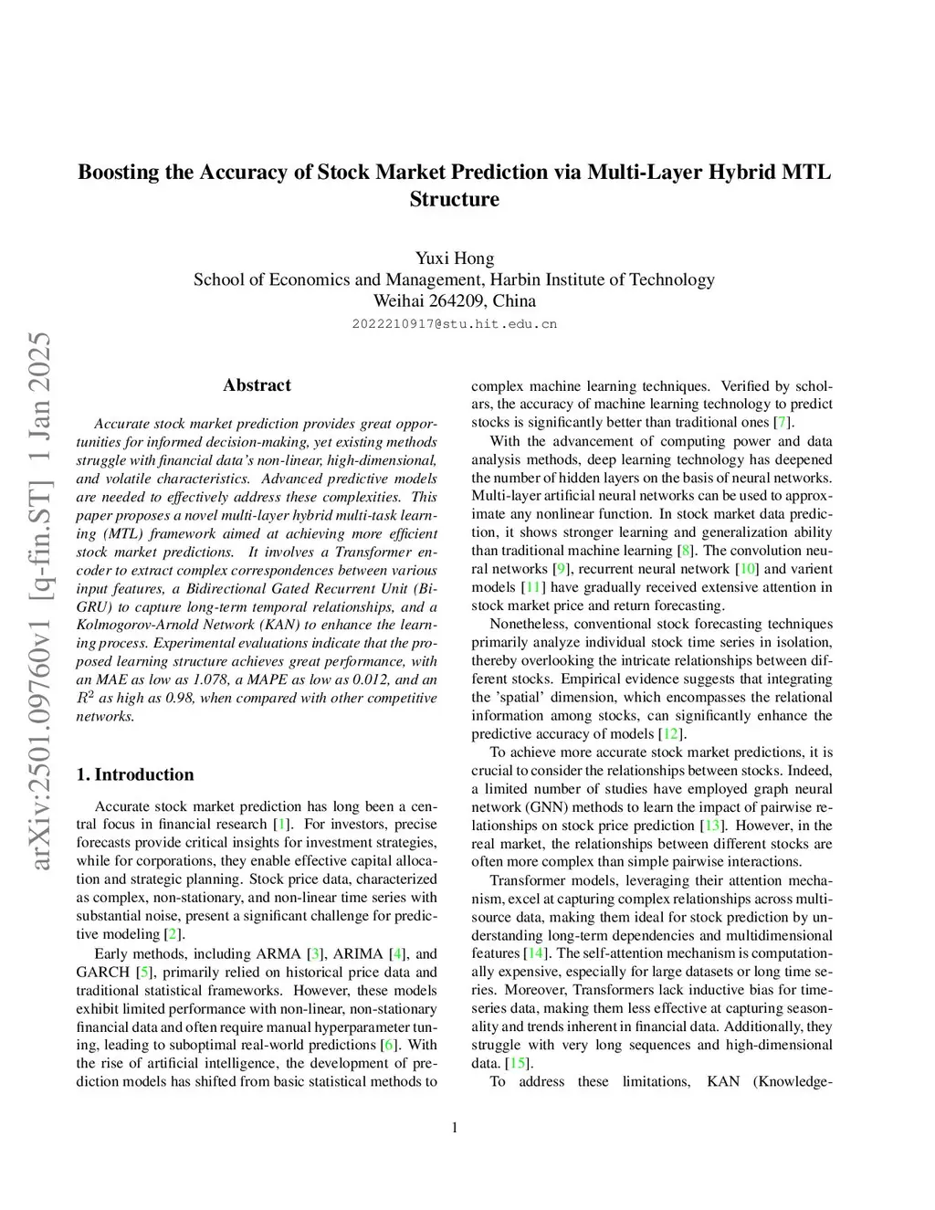 Accurate stock market prediction provides great opportunities for informed decision-making, yet existing methods struggle with financial data's non-linear, high-dimensional, and volatile characteristics. Advanced predictive models are needed to effectively address these complexities. This paper proposes a novel multi-layer hybrid multi-task learning (MTL) framework aimed at achieving more efficient stock market predictions. It involves a Transformer encoder to extract complex correspondences between various input features, a Bidirectional Gated Recurrent Unit (BiGRU) to capture long-term temporal relationships, and a Kolmogorov-Arnold Network (KAN) to enhance the learning process. Experimental evaluations indicate that the proposed learning structure achieves great performance, with an MAE as low as 1.078, a MAPE as low as 0.012, and an R^2 as high as 0.98, when compared with other competitive networks.