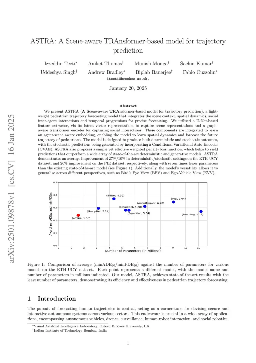 We present ASTRA (A} Scene-aware TRAnsformer-based model for trajectory prediction), a light-weight pedestrian trajectory forecasting model that integrates the scene context, spatial dynamics, social inter-agent interactions and temporal progressions for precise forecasting. We utilised a U-Net-based feature extractor, via its latent vector representation, to capture scene representations and a graph-aware transformer encoder for capturing social interactions. These components are integrated to learn an agent-scene aware embedding, enabling the model to learn spatial dynamics and forecast the future trajectory of pedestrians. The model is designed to produce both deterministic and stochastic outcomes, with the stochastic predictions being generated by incorporating a Conditional Variational Auto-Encoder (CVAE). ASTRA also proposes a simple yet effective weighted penalty loss function, which helps to yield predictions that outperform a wide array of state-of-the-art deterministic and generative models. ASTRA demonstrates an average improvement of 27%/10% in deterministic/stochastic settings on the ETH-UCY dataset, and 26% improvement on the PIE dataset, respectively, along with seven times fewer parameters than the existing state-of-the-art model (see Figure 1). Additionally, the model's versatility allows it to generalize across different perspectives, such as Bird's Eye View (BEV) and Ego-Vehicle View (EVV).