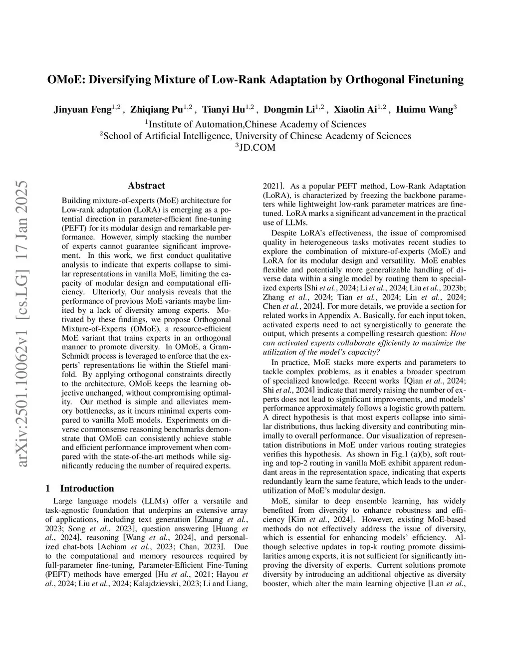 Building mixture-of-experts (MoE) architecture for Low-rank adaptation (LoRA) is emerging as a potential direction in parameter-efficient fine-tuning (PEFT) for its modular design and remarkable performance. However, simply stacking the number of experts cannot guarantee significant improvement. In this work, we first conduct qualitative analysis to indicate that experts collapse to similar representations in vanilla MoE, limiting the capacity of modular design and computational efficiency. Ulteriorly, Our analysis reveals that the performance of previous MoE variants maybe limited by a lack of diversity among experts. Motivated by these findings, we propose Orthogonal Mixture-of-Experts (OMoE), a resource-efficient MoE variant that trains experts in an orthogonal manner to promote diversity. In OMoE, a Gram-Schmidt process is leveraged to enforce that the experts' representations lie within the Stiefel manifold. By applying orthogonal constraints directly to the architecture, OMoE keeps the learning objective unchanged, without compromising optimality. Our method is simple and alleviates memory bottlenecks, as it incurs minimal experts compared to vanilla MoE models. Experiments on diverse commonsense reasoning benchmarks demonstrate that OMoE can consistently achieve stable and efficient performance improvement when compared with the state-of-the-art methods while significantly reducing the number of required experts.