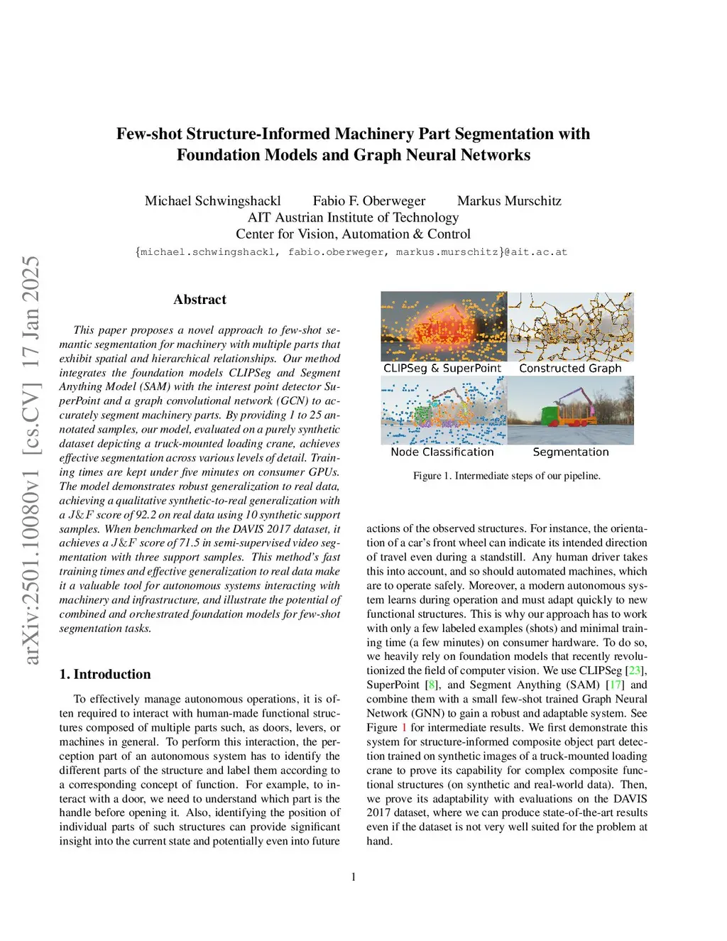 This paper proposes a novel approach to few-shot semantic segmentation for machinery with multiple parts that exhibit spatial and hierarchical relationships. Our method integrates the foundation models CLIPSeg and Segment Anything Model (SAM) with the interest point detector SuperPoint and a graph convolutional network (GCN) to accurately segment machinery parts. By providing 1 to 25 annotated samples, our model, evaluated on a purely synthetic dataset depicting a truck-mounted loading crane, achieves effective segmentation across various levels of detail. Training times are kept under five minutes on consumer GPUs. The model demonstrates robust generalization to real data, achieving a qualitative synthetic-to-real generalization with a score of 92.2 on real data using 10 synthetic support samples. When benchmarked on the DAVIS 2017 dataset, it achieves a score of 71.5 in semi-supervised video segmentation with three support samples. This method's fast training times and effective generalization to real data make it a valuable tool for autonomous systems interacting with machinery and infrastructure, and illustrate the potential of combined and orchestrated foundation models for few-shot segmentation tasks.