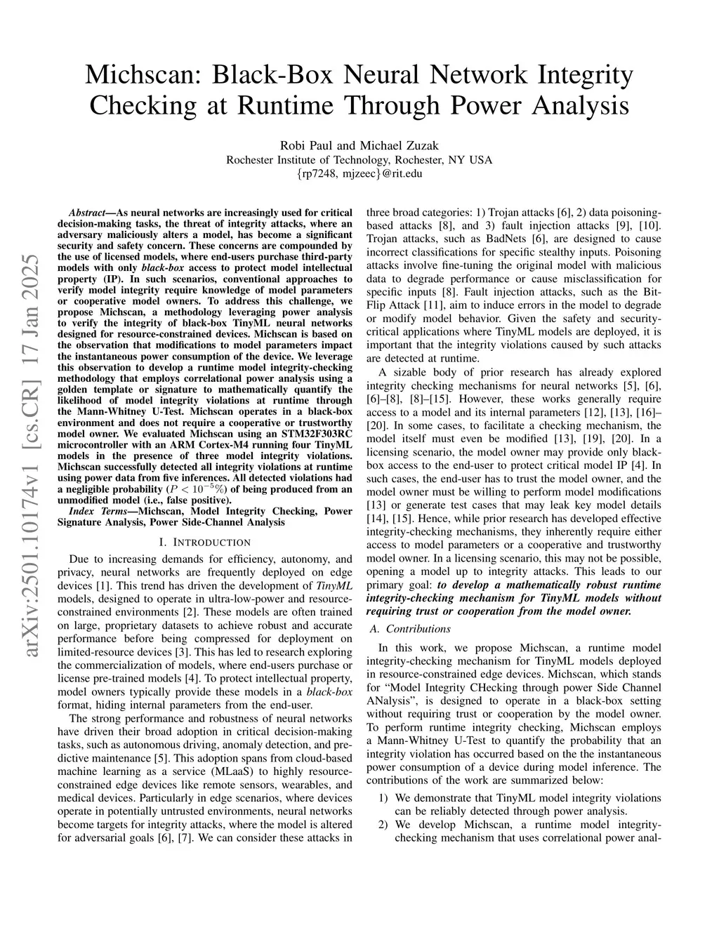 Michscan: Black-Box Neural Network Integrity Checking at Runtime Through Power Analysis