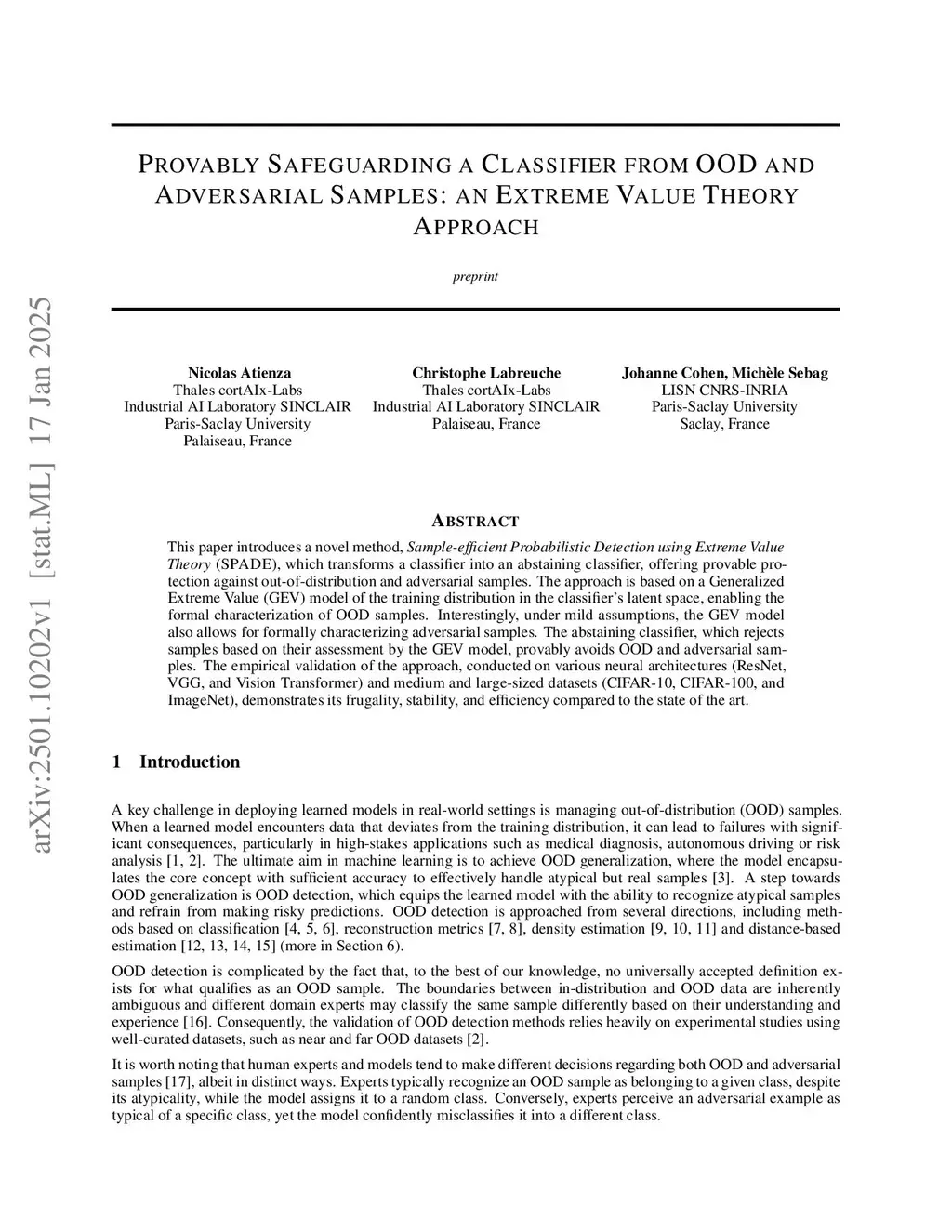 This paper introduces a novel method, Sample-efficient Probabilistic Detection using Extreme Value Theory (SPADE), which transforms a classifier into an abstaining classifier, offering provable protection against out-of-distribution and adversarial samples. The approach is based on a Generalized Extreme Value (GEV) model of the training distribution in the classifier's latent space, enabling the formal characterization of OOD samples. Interestingly, under mild assumptions, the GEV model also allows for formally characterizing adversarial samples. The abstaining classifier, which rejects samples based on their assessment by the GEV model, provably avoids OOD and adversarial samples. The empirical validation of the approach, conducted on various neural architectures (ResNet, VGG, and Vision Transformer) and medium and large-sized datasets (CIFAR-10, CIFAR-100, and ImageNet), demonstrates its frugality, stability, and efficiency compared to the state of the art.
