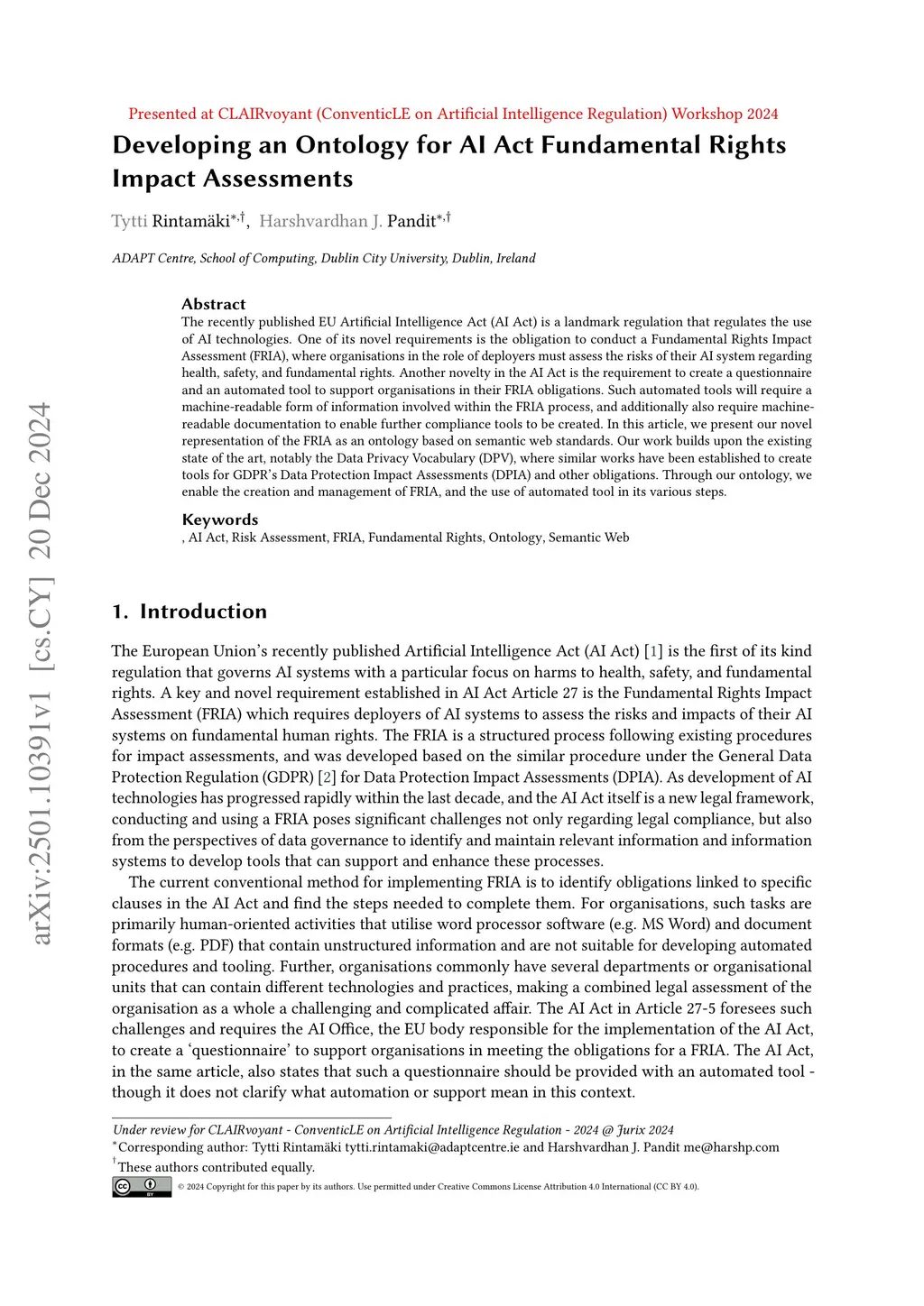 The recently published EU Artificial Intelligence Act (AI Act) is a landmark regulation that regulates the use of AI technologies. One of its novel requirements is the obligation to conduct a Fundamental Rights Impact Assessment (FRIA), where organisations in the role of deployers must assess the risks of their AI system regarding health, safety, and fundamental rights. Another novelty in the AI Act is the requirement to create a questionnaire and an automated tool to support organisations in their FRIA obligations. Such automated tools will require a machine-readable form of information involved within the FRIA process, and additionally also require machine-readable documentation to enable further compliance tools to be created. In this article, we present our novel representation of the FRIA as an ontology based on semantic web standards. Our work builds upon the existing state of the art, notably the Data Privacy Vocabulary (DPV), where similar works have been established to create tools for GDPR's Data Protection Impact Assessments (DPIA) and other obligations. Through our ontology, we enable the creation and management of FRIA, and the use of automated tool in its various steps.