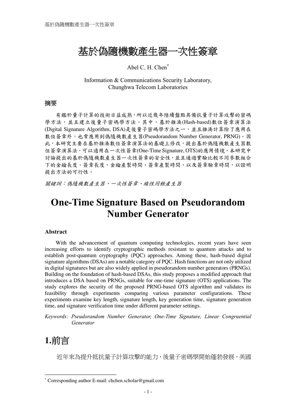 With the advancement of quantum computing technologies, recent years have seen increasing efforts to identify cryptographic methods resistant to quantum attacks and to establish post-quantum cryptography (PQC) approaches. Among these, hash-based digital signature algorithms (DSAs) are a notable category of PQC. Hash functions are not only utilized in digital signatures but are also widely applied in pseudorandom number generators (PRNGs). Building on the foundation of hash-based DSAs, this study proposes a modified approach that introduces a DSA based on PRNGs, suitable for one-time signature (OTS) applications. The study explores the security of the proposed PRNG-based OTS algorithm and validates its feasibility through experiments comparing various parameter configurations. These experiments examine key length, signature length, key generation time, signature generation time, and signature verification time under different parameter settings.