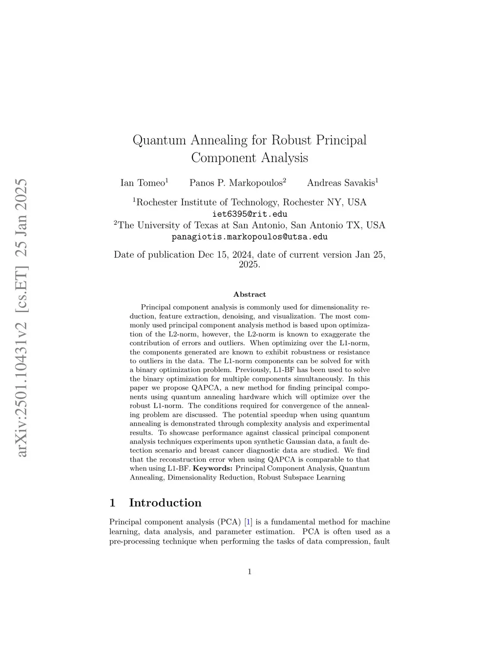 Principal component analysis is commonly used for dimensionality reduction, feature extraction, denoising, and visualization. The most commonly used principal component analysis method is based upon optimization of the L2-norm, however, the L2-norm is known to exaggerate the contribution of errors and outliers. When optimizing over the L1-norm, the components generated are known to exhibit robustness or resistance to outliers in the data. The L1-norm components can be solved for with a binary optimization problem. Previously, L1-BF has been used to solve the binary optimization for multiple components simultaneously. In this paper we propose QAPCA, a new method for finding principal components using quantum annealing hardware which will optimize over the robust L1-norm. The conditions required for convergence of the annealing problem are discussed. The potential speedup when using quantum annealing is demonstrated through complexity analysis and experimental results. To showcase performance against classical principal component analysis techniques experiments upon synthetic Gaussian data, a fault detection scenario and breast cancer diagnostic data are studied. We find that the reconstruction error when using QAPCA is comparable to that when using L1-BF.