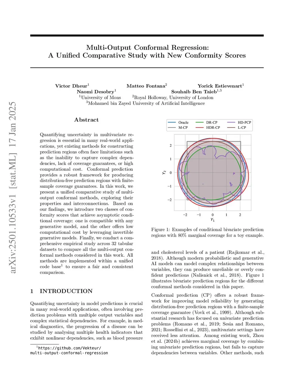 Conformal prediction provides a powerful framework for constructing distribution-free prediction regions with finite-sample coverage guarantees. While extensively studied in univariate settings, its extension to multi-output problems presents additional challenges, including complex output dependencies and high computational costs, and remains relatively underexplored. In this work, we present a unified comparative study of nine conformal methods with different multivariate base models for constructing multivariate prediction regions within the same framework. This study highlights their key properties while also exploring the connections between them. Additionally, we introduce two novel classes of conformity scores for multi-output regression that generalize their univariate counterparts. These scores ensure asymptotic conditional coverage while maintaining exact finite-sample marginal coverage. One class is compatible with any generative model, offering broad applicability, while the other is computationally efficient, leveraging the properties of invertible generative models. Finally, we conduct a comprehensive empirical evaluation across 13 tabular datasets, comparing all the multi-output conformal methods explored in this work. To ensure a fair and consistent comparison, all methods are implemented within a unified code base.
