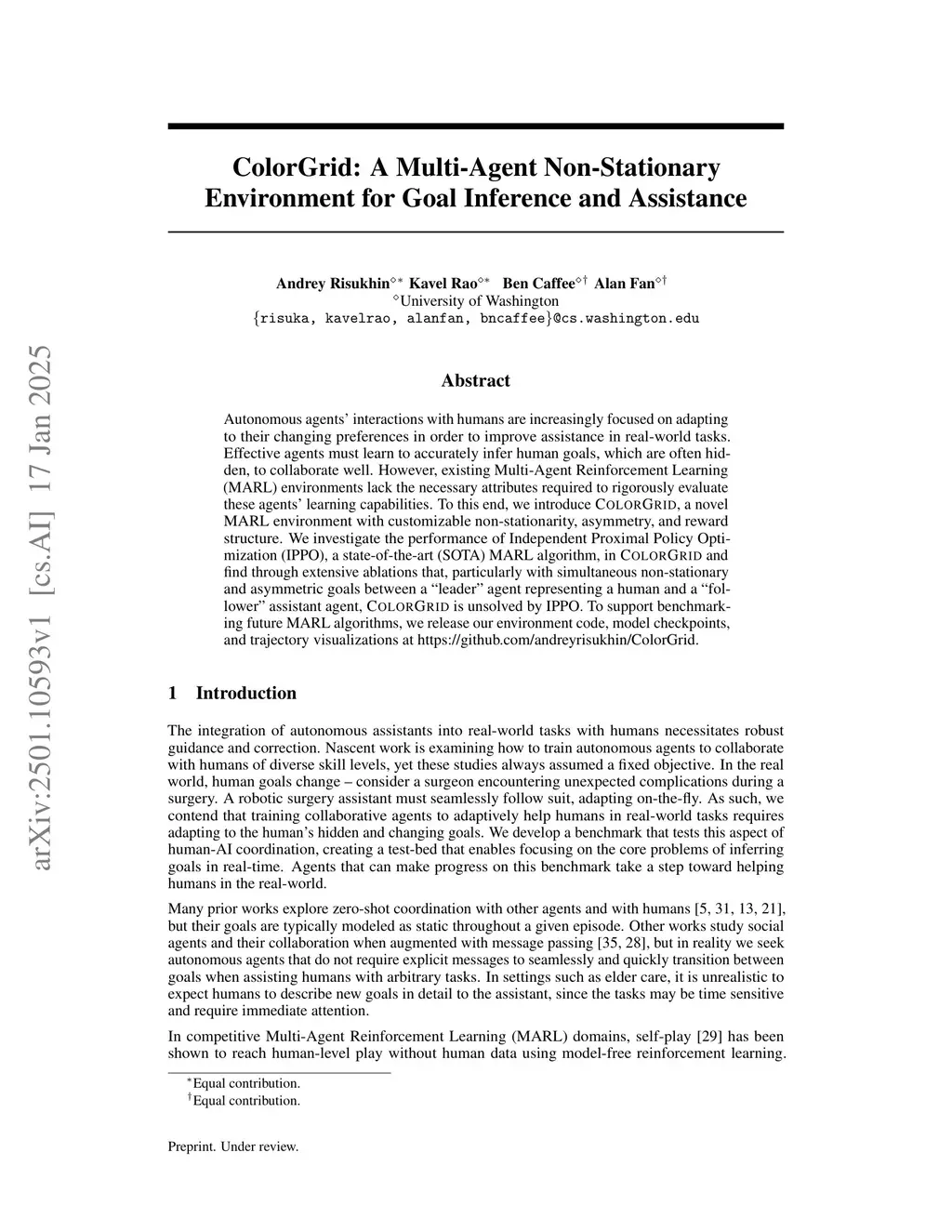 Autonomous agents' interactions with humans are increasingly focused on adapting to their changing preferences in order to improve assistance in real-world tasks. Effective agents must learn to accurately infer human goals, which are often hidden, to collaborate well. However, existing Multi-Agent Reinforcement Learning (MARL) environments lack the necessary attributes required to rigorously evaluate these agents' learning capabilities. To this end, we introduce ColorGrid, a novel MARL environment with customizable non-stationarity, asymmetry, and reward structure. We investigate the performance of Independent Proximal Policy Optimization (IPPO), a state-of-the-art (SOTA) MARL algorithm, in ColorGrid and find through extensive ablations that, particularly with simultaneous non-stationary and asymmetric goals between a ``leader'' agent representing a human and a ``follower'' assistant agent, ColorGrid is unsolved by IPPO. To support benchmarking future MARL algorithms, we release our environment code, model checkpoints, and trajectory visualizations atthis https URL.