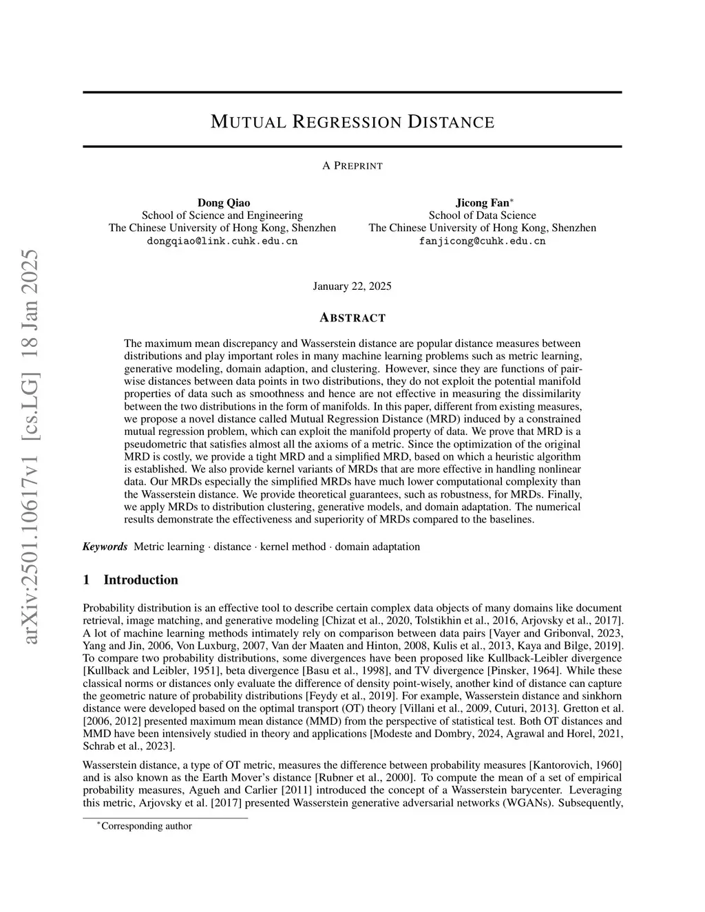 The maximum mean discrepancy and Wasserstein distance are popular distance measures between distributions and play important roles in many machine learning problems such as metric learning, generative modeling, domain adaption, and clustering. However, since they are functions of pair-wise distances between data points in two distributions, they do not exploit the potential manifold properties of data such as smoothness and hence are not effective in measuring the dissimilarity between the two distributions in the form of manifolds. In this paper, different from existing measures, we propose a novel distance called Mutual Regression Distance (MRD) induced by a constrained mutual regression problem, which can exploit the manifold property of data. We prove that MRD is a pseudometric that satisfies almost all the axioms of a metric. Since the optimization of the original MRD is costly, we provide a tight MRD and a simplified MRD, based on which a heuristic algorithm is established. We also provide kernel variants of MRDs that are more effective in handling nonlinear data. Our MRDs especially the simplified MRDs have much lower computational complexity than the Wasserstein distance. We provide theoretical guarantees, such as robustness, for MRDs. Finally, we apply MRDs to distribution clustering, generative models, and domain adaptation. The numerical results demonstrate the effectiveness and superiority of MRDs compared to the baselines.