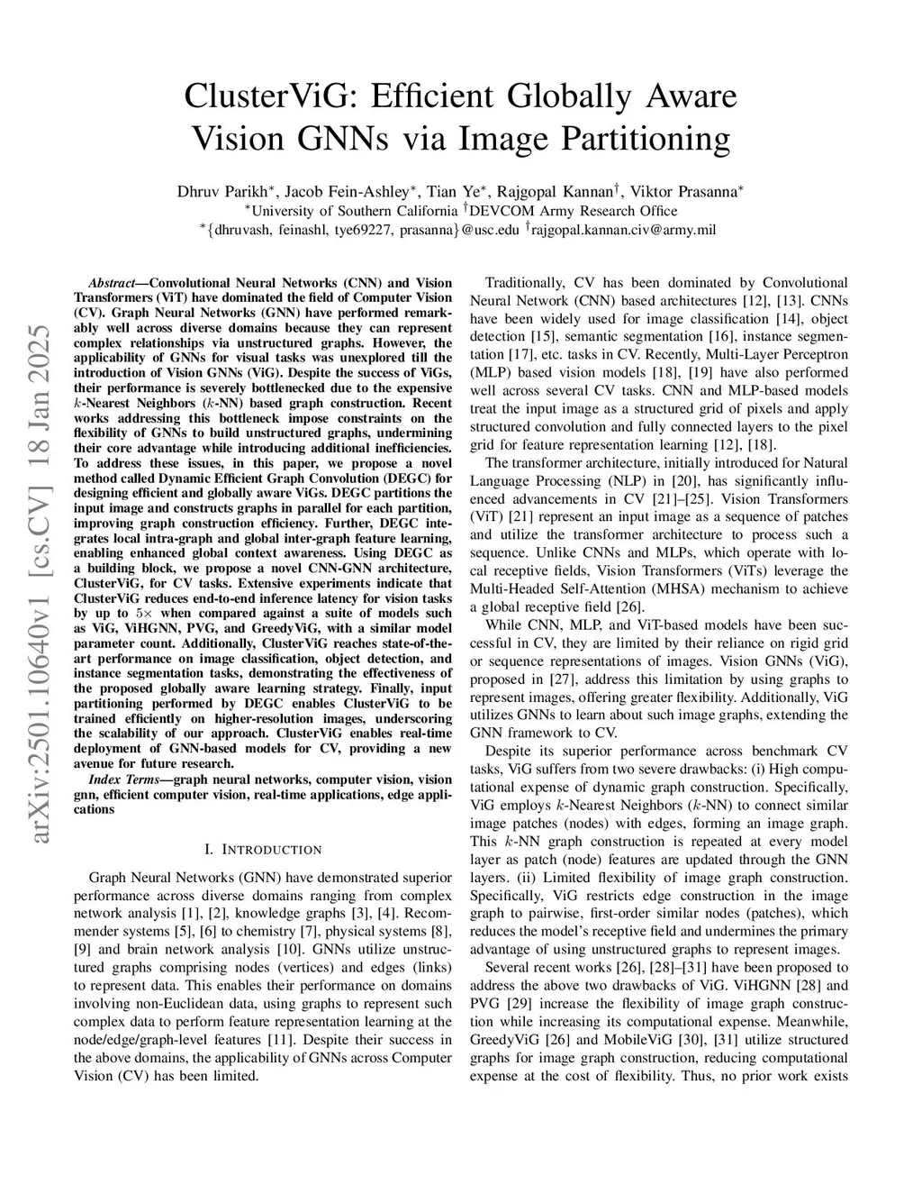 Convolutional Neural Networks (CNN) and Vision Transformers (ViT) have dominated the field of Computer Vision (CV). Graph Neural Networks (GNN) have performed remarkably well across diverse domains because they can represent complex relationships via unstructured graphs. However, the applicability of GNNs for visual tasks was unexplored till the introduction of Vision GNNs (ViG). Despite the success of ViGs, their performance is severely bottlenecked due to the expensive -Nearest Neighbors (-NN) based graph construction. Recent works addressing this bottleneck impose constraints on the flexibility of GNNs to build unstructured graphs, undermining their core advantage while introducing additional inefficiencies. To address these issues, in this paper, we propose a novel method called Dynamic Efficient Graph Convolution (DEGC) for designing efficient and globally aware ViGs. DEGC partitions the input image and constructs graphs in parallel for each partition, improving graph construction efficiency. Further, DEGC integrates local intra-graph and global inter-graph feature learning, enabling enhanced global context awareness. Using DEGC as a building block, we propose a novel CNN-GNN architecture, ClusterViG, for CV tasks. Extensive experiments indicate that ClusterViG reduces end-to-end inference latency for vision tasks by up to when compared against a suite of models such as ViG, ViHGNN, PVG, and GreedyViG, with a similar model parameter count. Additionally, ClusterViG reaches state-of-the-art performance on image classification, object detection, and instance segmentation tasks, demonstrating the effectiveness of the proposed globally aware learning strategy. Finally, input partitioning performed by DEGC enables ClusterViG to be trained efficiently on higher-resolution images, underscoring the scalability of our approach.