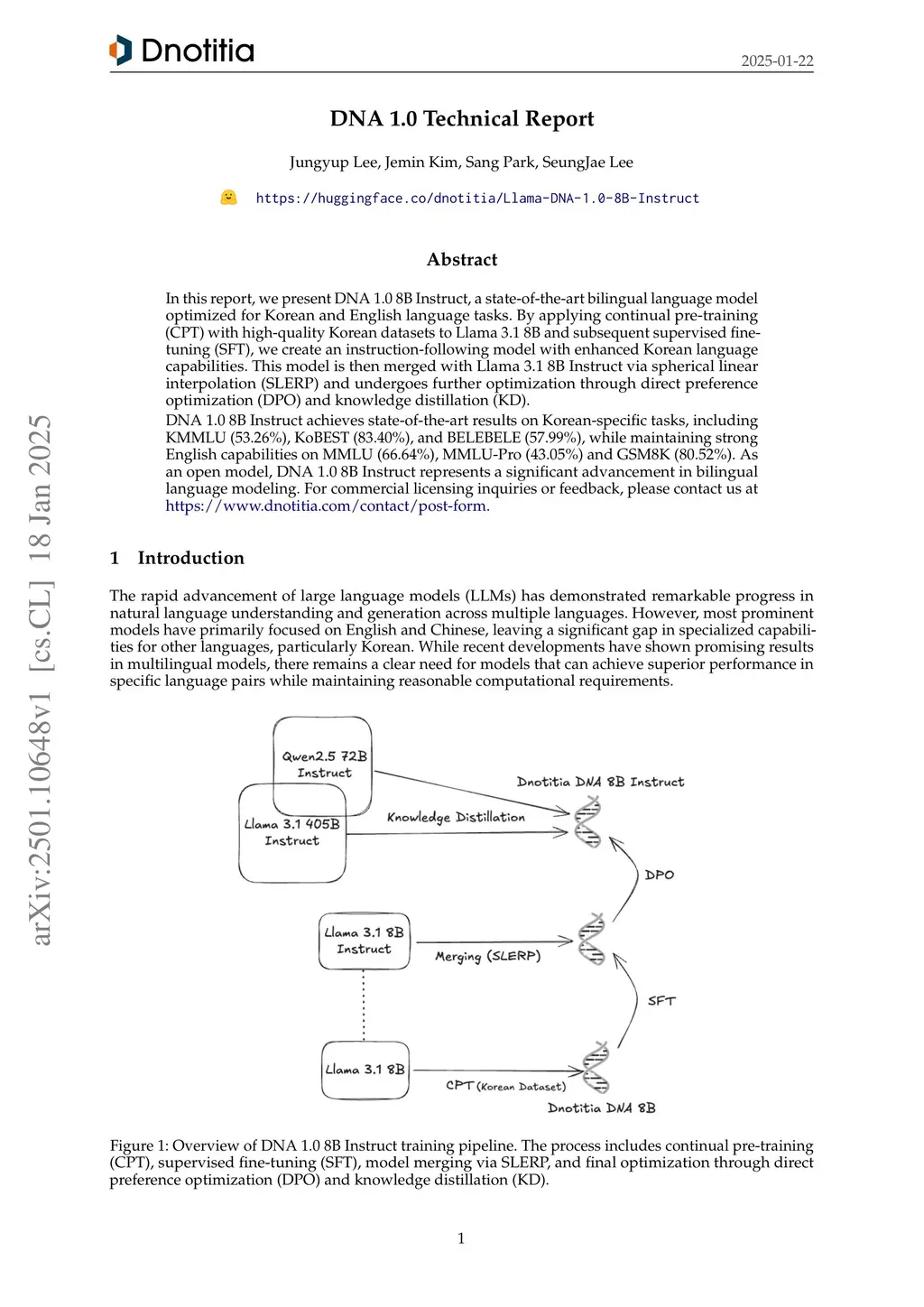 In this report, we present DNA 1.0 8B Instruct, a state-of-the-art bilingual language model optimized for Korean and English language tasks. By applying continual pre-training (CPT) with high-quality Korean datasets to Llama 3.1 8B and subsequent supervised fine-tuning (SFT), we create an instruction-following model with enhanced Korean language capabilities. This model is then merged with Llama 3.1 8B Instruct via spherical linear interpolation (SLERP) and undergoes further optimization through direct preference optimization (DPO) and knowledge distillation (KD). DNA 1.0 8B Instruct achieves state-of-the-art results on Korean-specific tasks, including KMMLU (53.26%), KoBEST (83.40%), and BELEBELE (57.99%), while maintaining strong English capabilities on MMLU (66.64%), MMLU-Pro (43.05%) and GSM8K (80.52%). As an open model, DNA 1.0 8B Instruct represents a significant advancement in bilingual language modeling.As an open model, DNA 1.0 8B Instruct is freely available throughthis https URL. For commercial licensing inquiries or feedback, please contact us atthis https URL