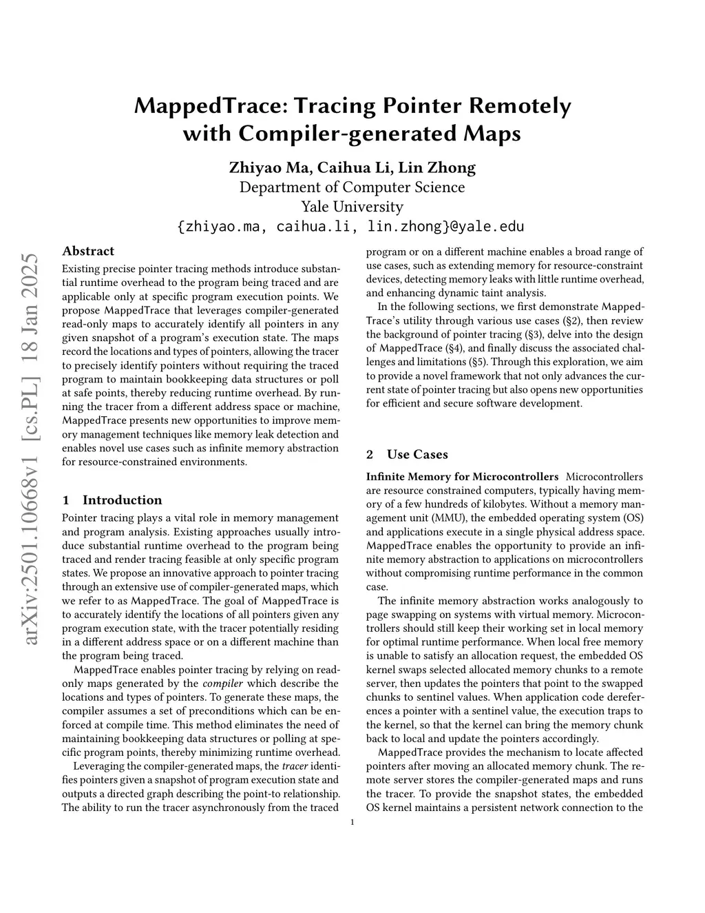 Existing precise pointer tracing methods introduce substantial runtime overhead to the program being traced and are applicable only at specific program execution points. We propose MappedTrace that leverages compiler-generated read-only maps to accurately identify all pointers in any given snapshot of a program's execution state. The maps record the locations and types of pointers, allowing the tracer to precisely identify pointers without requiring the traced program to maintain bookkeeping data structures or poll at safe points, thereby reducing runtime overhead. By running the tracer from a different address space or machine, MappedTrace presents new opportunities to improve memory management techniques like memory leak detection and enables novel use cases such as infinite memory abstraction for resource-constrained environments.