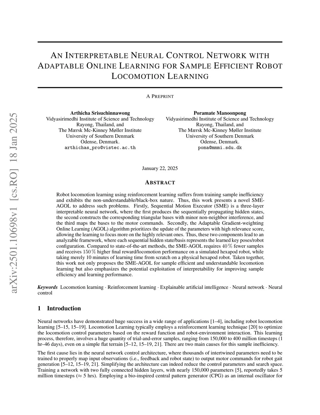 An Interpretable Neural Control Network with Adaptable Online Learning for Sample Efficient Robot Locomotion Learning