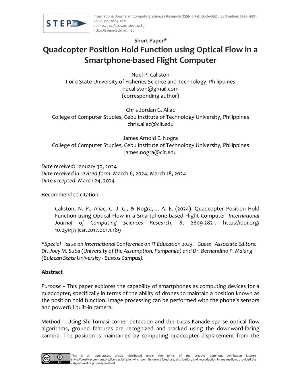 Purpose. This paper explores the capability of smartphones as computing devices for a quadcopter, specifically in terms of the ability of drones to maintain a position known as the position hold function. Image processing can be performed with the phone's sensors and powerful built-in camera. Method. Using Shi-Tomasi corner detection and the Lucas-Kanade sparse optical flow algorithms, ground features are recognized and tracked using the downward-facing camera. The position is maintained by computing quadcopter displacement from the center of the image using Euclidian distance, and the corresponding pitch and roll estimate is calculated using the PID controller. Results. Actual flights show a double standard deviation of 18.66 cm from the center for outdoor tests. With a quadcopter size of 58cm x 58cm used, it implies that 95% of the time, the quadcopter is within a diameter of 96 cm. For indoor tests, a double standard deviation of 10.55 cm means that 95% of the time, the quadcopter is within a diameter of 79 cm. Conclusion. Smartphone sensors and cameras can be used to perform optical flow position hold functions, proving their potential as computing devices for drones. Recommendations. To further improve the positioning system of the phone-based quadcopter system, it is suggested that potential sensor fusion be explored with the phone's GNSS sensor, which gives absolute positioning information for outdoor applications. Research Implications. As different devices and gadgets are integrated into the smartphone, this paper presents an opportunity for phone manufacturers and researchers to explore the potential of smartphones for a drone use-case.