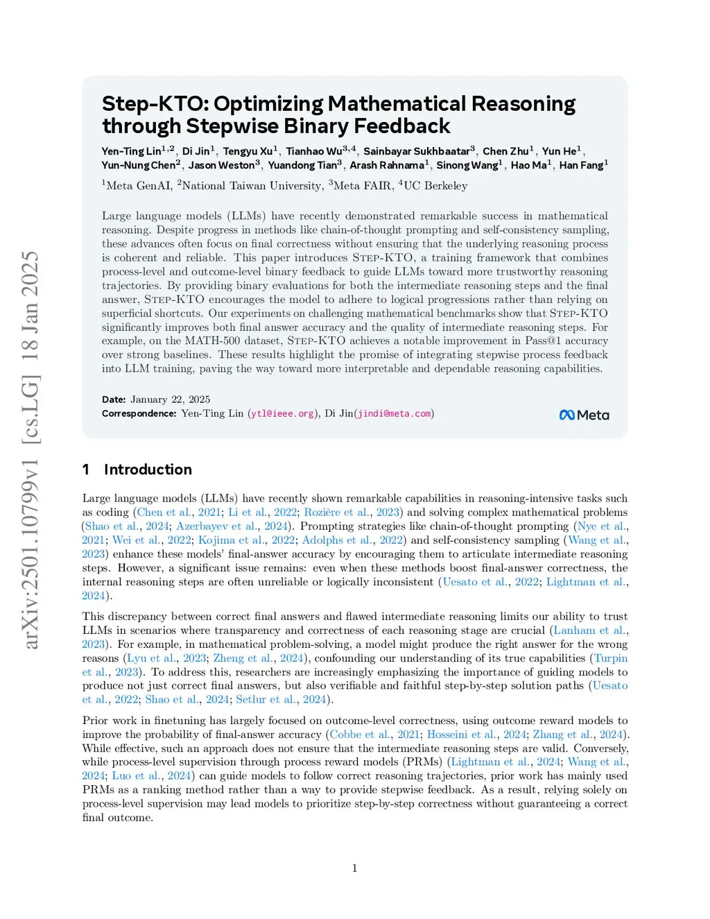 Large language models (LLMs) have recently demonstrated remarkable success in mathematical reasoning. Despite progress in methods like chain-of-thought prompting and self-consistency sampling, these advances often focus on final correctness without ensuring that the underlying reasoning process is coherent and reliable. This paper introduces Step-KTO, a training framework that combines process-level and outcome-level binary feedback to guide LLMs toward more trustworthy reasoning trajectories. By providing binary evaluations for both the intermediate reasoning steps and the final answer, Step-KTO encourages the model to adhere to logical progressions rather than relying on superficial shortcuts. Our experiments on challenging mathematical benchmarks show that Step-KTO significantly improves both final answer accuracy and the quality of intermediate reasoning steps. For example, on the MATH-500 dataset, Step-KTO achieves a notable improvement in Pass@1 accuracy over strong baselines. These results highlight the promise of integrating stepwise process feedback into LLM training, paving the way toward more interpretable and dependable reasoning capabilities.