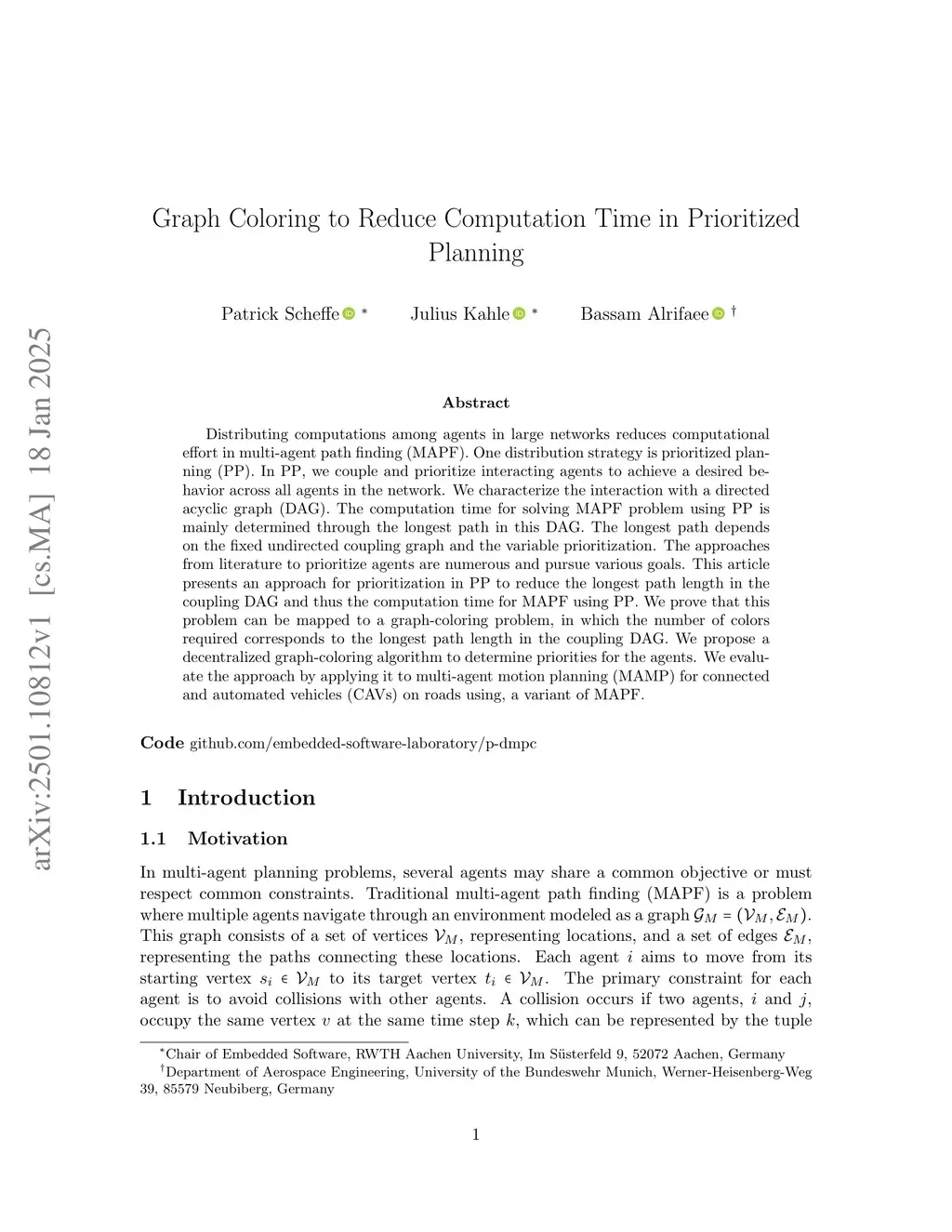 Distributing computations among agents in large networks reduces computational effort in multi-agent path finding (MAPF). One distribution strategy is prioritized planning (PP). In PP, we couple and prioritize interacting agents to achieve a desired behavior across all agents in the network. We characterize the interaction with a directed acyclic graph (DAG). The computation time for solving MAPF problem using PP is mainly determined through the longest path in this DAG. The longest path depends on the fixed undirected coupling graph and the variable prioritization. The approaches from literature to prioritize agents are numerous and pursue various goals. This article presents an approach for prioritization in PP to reduce the longest path length in the coupling DAG and thus the computation time for MAPF using PP. We prove that this problem can be mapped to a graph-coloring problem, in which the number of colors required corresponds to the longest path length in the coupling DAG. We propose a decentralized graph-coloring algorithm to determine priorities for the agents. We evaluate the approach by applying it to multi-agent motion planning (MAMP) for connected and automated vehicles (CAVs) on roads using, a variant of MAPF.