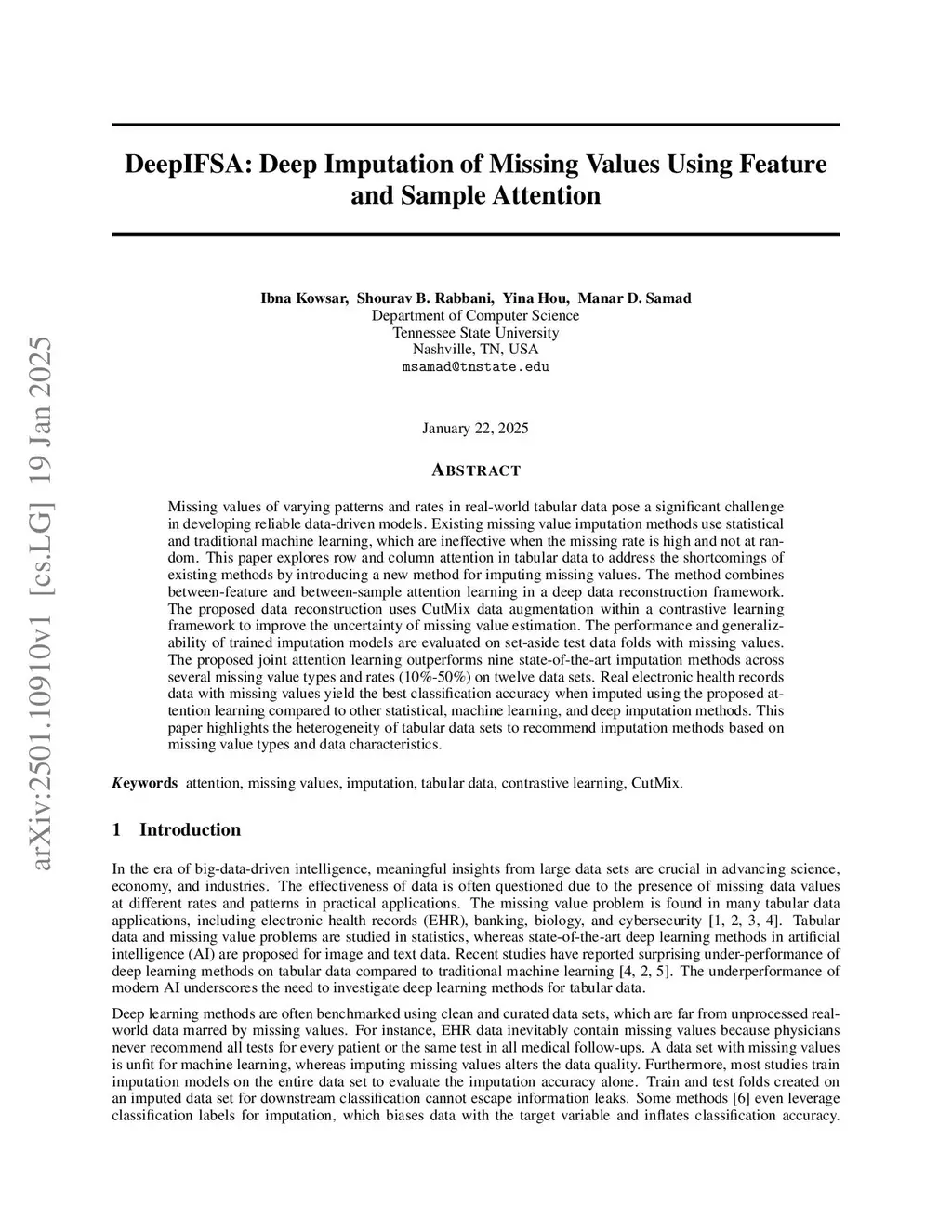 DeepIFSAC: Deep Imputation of Missing Values Using Feature and Sample Attention within Contrastive Framework