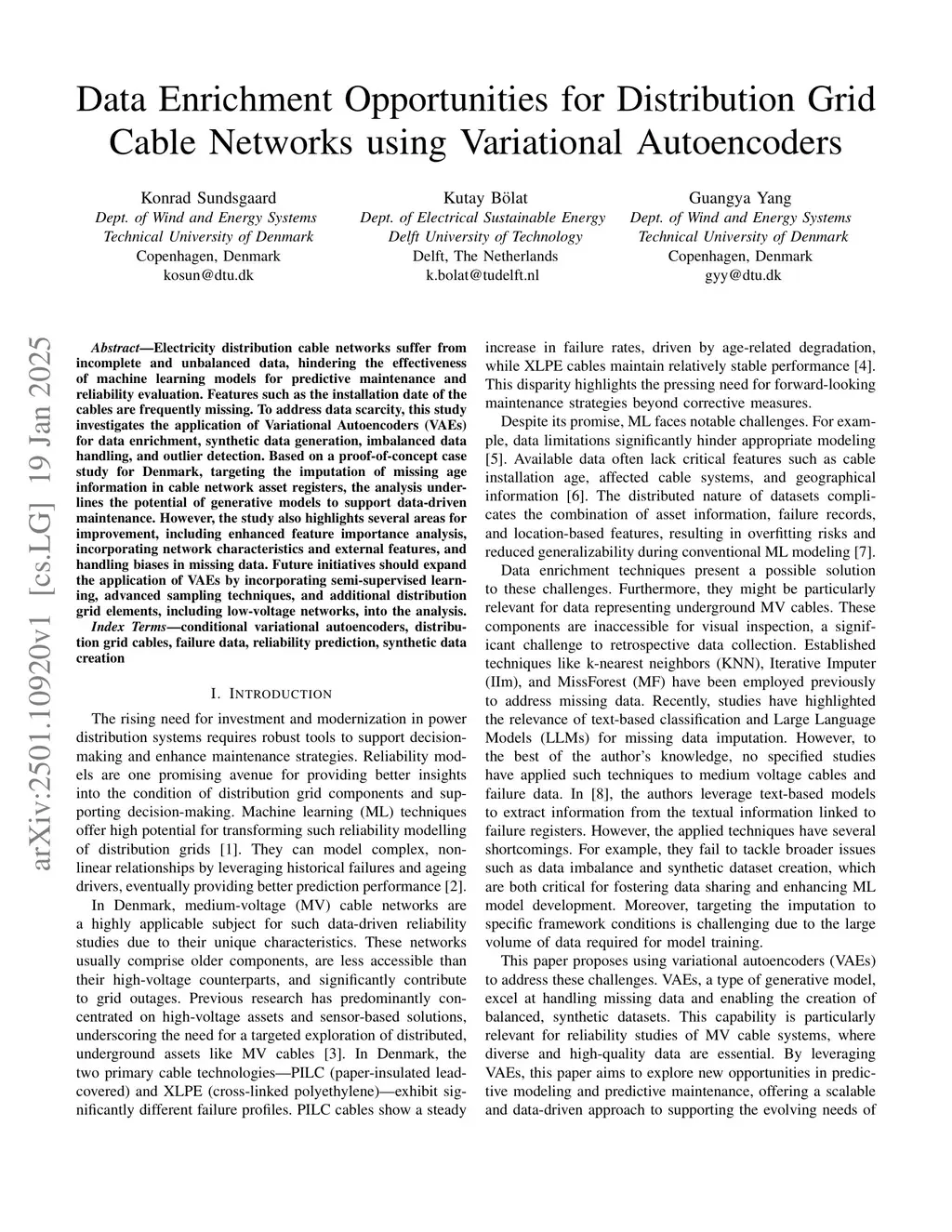 Electricity distribution cable networks suffer from incomplete and unbalanced data, hindering the effectiveness of machine learning models for predictive maintenance and reliability evaluation. Features such as the installation date of the cables are frequently missing. To address data scarcity, this study investigates the application of Variational Autoencoders (VAEs) for data enrichment, synthetic data generation, imbalanced data handling, and outlier detection. Based on a proof-of-concept case study for Denmark, targeting the imputation of missing age information in cable network asset registers, the analysis underlines the potential of generative models to support data-driven maintenance. However, the study also highlights several areas for improvement, including enhanced feature importance analysis, incorporating network characteristics and external features, and handling biases in missing data. Future initiatives should expand the application of VAEs by incorporating semi-supervised learning, advanced sampling techniques, and additional distribution grid elements, including low-voltage networks, into the analysis.