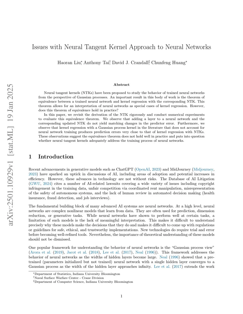 Neural tangent kernels (NTKs) have been proposed to study the behavior of trained neural networks from the perspective of Gaussian processes. An important result in this body of work is the theorem of equivalence between a trained neural network and kernel regression with the corresponding NTK. This theorem allows for an interpretation of neural networks as special cases of kernel regression. However, does this theorem of equivalence hold in practice?In this paper, we revisit the derivation of the NTK rigorously and conduct numerical experiments to evaluate this equivalence theorem. We observe that adding a layer to a neural network and the corresponding updated NTK do not yield matching changes in the predictor error. Furthermore, we observe that kernel regression with a Gaussian process kernel in the literature that does not account for neural network training produces prediction errors very close to that of kernel regression with NTKs. These observations suggest the equivalence theorem does not hold well in practice and puts into question whether neural tangent kernels adequately address the training process of neural networks.
