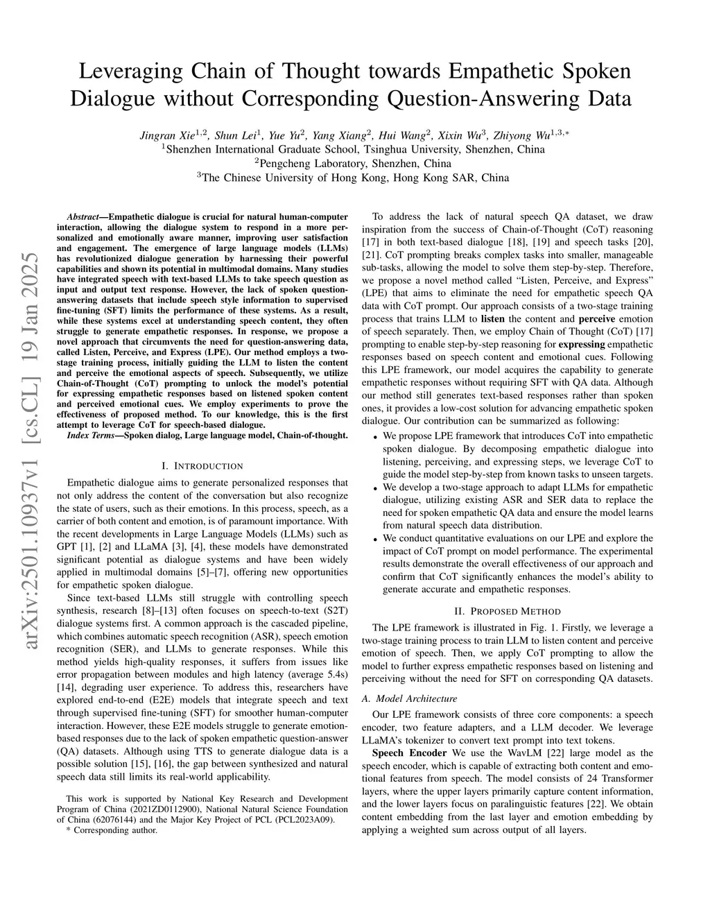Empathetic dialogue is crucial for natural human-computer interaction, allowing the dialogue system to respond in a more personalized and emotionally aware manner, improving user satisfaction and engagement. The emergence of large language models (LLMs) has revolutionized dialogue generation by harnessing their powerful capabilities and shown its potential in multimodal domains. Many studies have integrated speech with text-based LLMs to take speech question as input and output text response. However, the lack of spoken question-answering datasets that include speech style information to supervised fine-tuning (SFT) limits the performance of these systems. As a result, while these systems excel at understanding speech content, they often struggle to generate empathetic responses. In response, we propose a novel approach that circumvents the need for question-answering data, called Listen, Perceive, and Express (LPE). Our method employs a two-stage training process, initially guiding the LLM to listen the content and perceive the emotional aspects of speech. Subsequently, we utilize Chain-of-Thought (CoT) prompting to unlock the model's potential for expressing empathetic responses based on listened spoken content and perceived emotional cues. We employ experiments to prove the effectiveness of proposed method. To our knowledge, this is the first attempt to leverage CoT for speech-based dialogue.