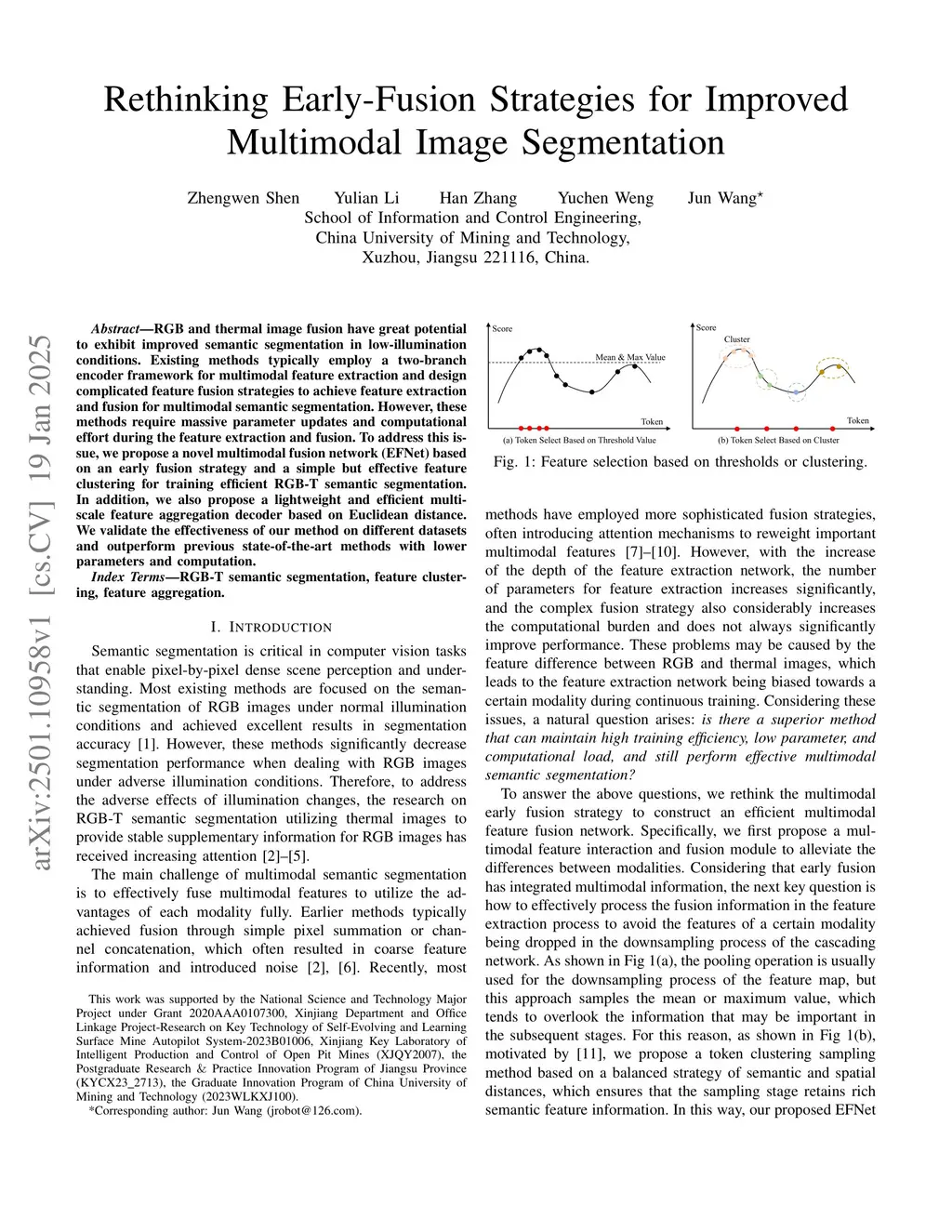 RGB and thermal image fusion have great potential to exhibit improved semantic segmentation in low-illumination conditions. Existing methods typically employ a two-branch encoder framework for multimodal feature extraction and design complicated feature fusion strategies to achieve feature extraction and fusion for multimodal semantic segmentation. However, these methods require massive parameter updates and computational effort during the feature extraction and fusion. To address this issue, we propose a novel multimodal fusion network (EFNet) based on an early fusion strategy and a simple but effective feature clustering for training efficient RGB-T semantic segmentation. In addition, we also propose a lightweight and efficient multi-scale feature aggregation decoder based on Euclidean distance. We validate the effectiveness of our method on different datasets and outperform previous state-of-the-art methods with lower parameters and computation.
