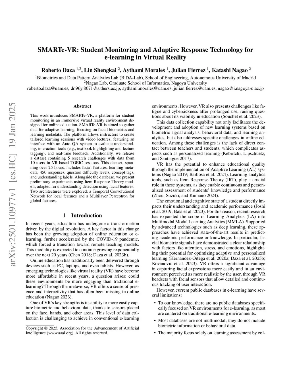 This work introduces SMARTe-VR, a platform for student monitoring in an immersive virtual reality environment designed for online education. SMARTe-VR aims to collect data for adaptive learning, focusing on facial biometrics and learning metadata. The platform allows instructors to create customized learning sessions with video lectures, featuring an interface with an AutoQA system to evaluate understanding, interaction tools (for example, textbook highlighting and lecture tagging), and real-time feedback. Furthermore, we released a dataset that contains 5 research challenges with data from 10 users in VR-based TOEIC sessions. This data set, which spans more than 25 hours, includes facial features, learning metadata, 450 responses, difficulty levels of the questions, concept tags, and understanding labels. Alongside the database, we present preliminary experiments using Item Response Theory models, adapted for understanding detection using facial features. Two architectures were explored: a Temporal Convolutional Network for local features and a Multilayer Perceptron for global features.