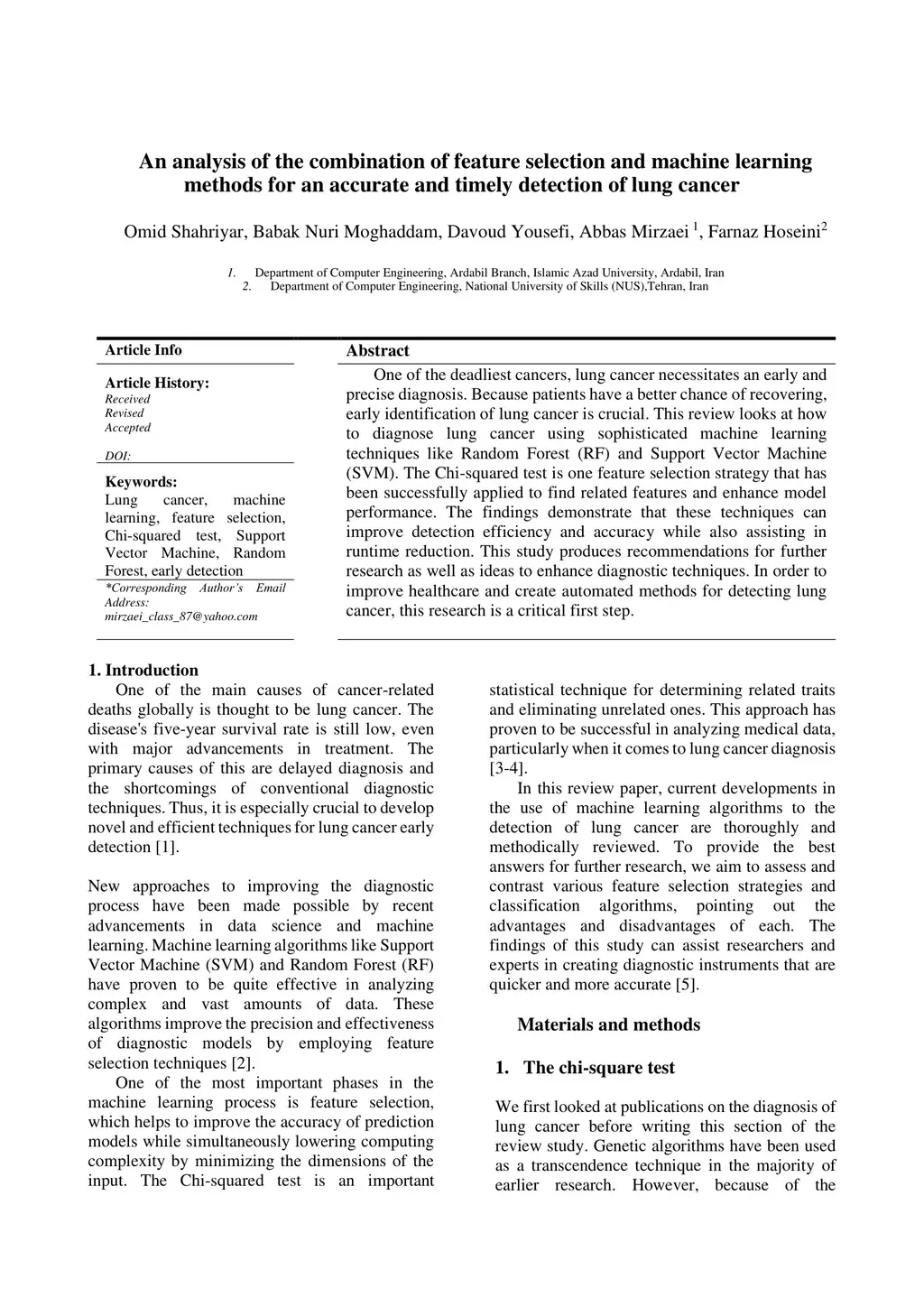 An analysis of the combination of feature selection and machine learning methods for an accurate and timely detection of lung cancer