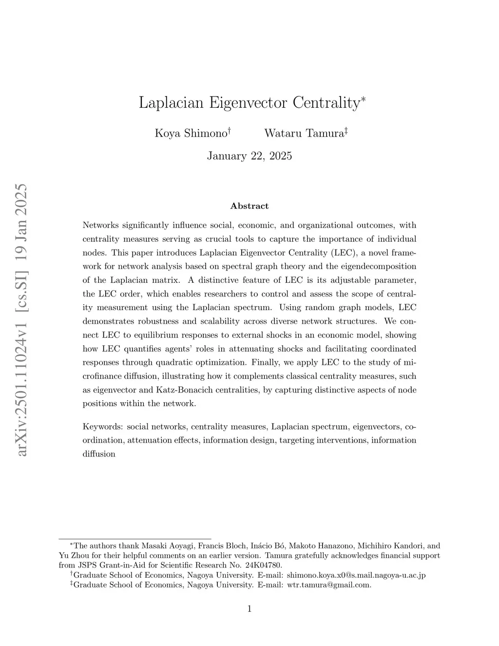Networks significantly influence social, economic, and organizational outcomes, with centrality measures serving as crucial tools to capture the importance of individual nodes. This paper introduces Laplacian Eigenvector Centrality (LEC), a novel framework for network analysis based on spectral graph theory and the eigendecomposition of the Laplacian matrix. A distinctive feature of LEC is its adjustable parameter, the LEC order, which enables researchers to control and assess the scope of centrality measurement using the Laplacian spectrum. Using random graph models, LEC demonstrates robustness and scalability across diverse network structures. We connect LEC to equilibrium responses to external shocks in an economic model, showing how LEC quantifies agents' roles in attenuating shocks and facilitating coordinated responses through quadratic optimization. Finally, we apply LEC to the study of microfinance diffusion, illustrating how it complements classical centrality measures, such as eigenvector and Katz-Bonacich centralities, by capturing distinctive aspects of node positions within the network.