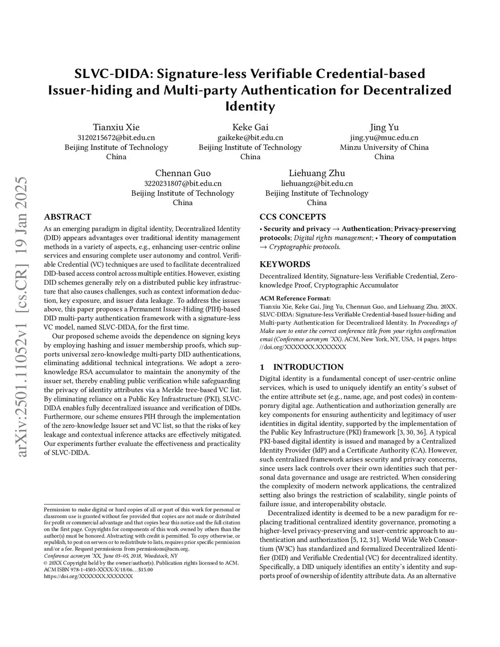 SLVC-DIDA: Signature-less Verifiable Credential-based Issuer-hiding and Multi-party Authentication for Decentralized Identity