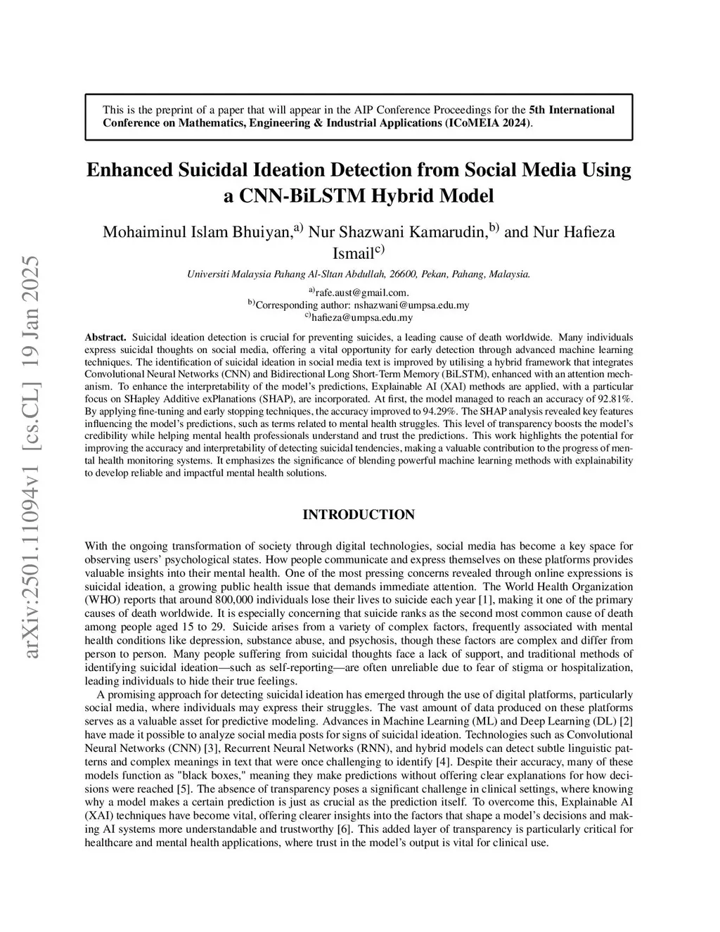 Enhanced Suicidal Ideation Detection from Social Media Using a CNN-BiLSTM Hybrid Model