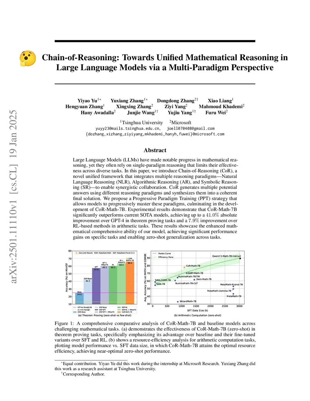 Large Language Models (LLMs) have made notable progress in mathematical reasoning, yet often rely on single-paradigm reasoning, limiting their effectiveness across diverse tasks. We introduce Chain-of-Reasoning (CoR), a novel unified framework integrating multiple reasoning paradigms--Natural Language Reasoning (NLR), Algorithmic Reasoning (AR), and Symbolic Reasoning (SR)--to enable synergistic collaboration. CoR generates multiple potential answers via different reasoning paradigms and synthesizes them into a coherent final solution. We propose a Progressive Paradigm Training (PPT) strategy for models to progressively master these paradigms, leading to CoR-Math-7B. Experimental results demonstrate that CoR-Math-7B significantly outperforms current SOTA models, achieving up to a 41.0% absolute improvement over GPT-4o in theorem proving and a 15.0% improvement over RL-based methods on the MATH benchmark in arithmetic tasks. These results show the enhanced mathematical comprehension ability of our model, enabling zero-shot generalization across tasks.