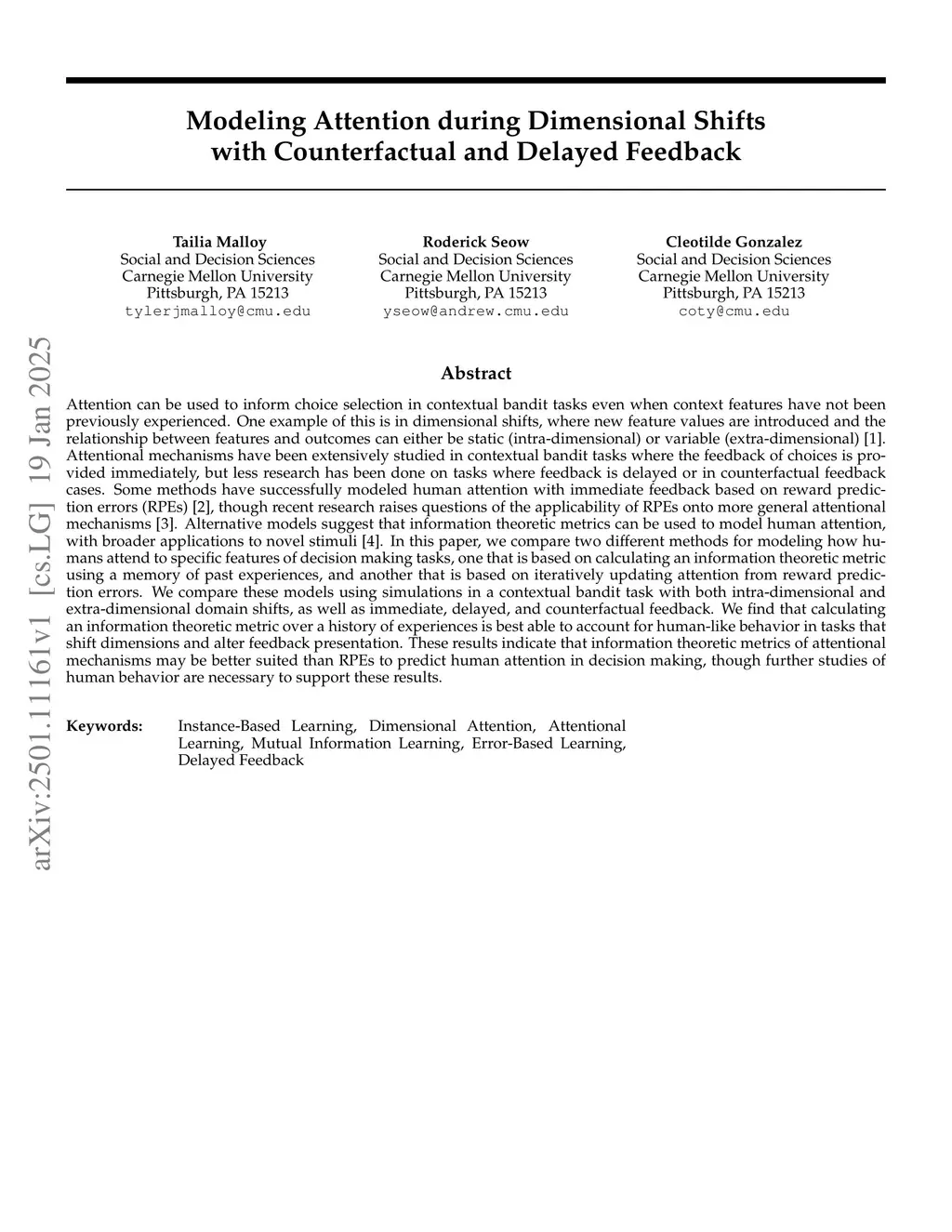 Attention can be used to inform choice selection in contextual bandit tasks even when context features have not been previously experienced. One example of this is in dimensional shifts, where additional feature values are introduced and the relationship between features and outcomes can either be static or variable. Attentional mechanisms have been extensively studied in contextual bandit tasks where the feedback of choices is provided immediately, but less research has been done on tasks where feedback is delayed or in counterfactual feedback cases. Some methods have successfully modeled human attention with immediate feedback based on reward prediction errors (RPEs), though recent research raises questions of the applicability of RPEs onto more general attentional mechanisms. Alternative models suggest that information theoretic metrics can be used to model human attention, with broader applications to novel stimuli. In this paper, we compare two different methods for modeling how humans attend to specific features of decision making tasks, one that is based on calculating an information theoretic metric using a memory of past experiences, and another that is based on iteratively updating attention from reward prediction errors. We compare these models using simulations in a contextual bandit task with both intradimensional and extradimensional domain shifts, as well as immediate, delayed, and counterfactual feedback. We find that calculating an information theoretic metric over a history of experiences is best able to account for human-like behavior in tasks that shift dimensions and alter feedback presentation. These results indicate that information theoretic metrics of attentional mechanisms may be better suited than RPEs to predict human attention in decision making, though further studies of human behavior are necessary to support these results.