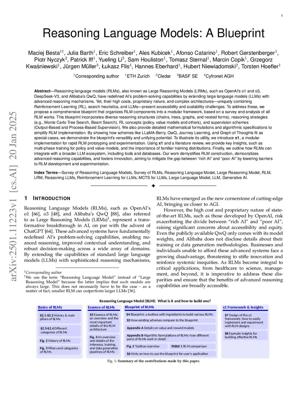 Reasoning language models (RLMs), also known as Large Reasoning Models (LRMs), such as OpenAI's o1 and o3, DeepSeek-R1, and Alibaba's QwQ, have redefined AI's problem-solving capabilities by extending LLMs with advanced reasoning mechanisms. Yet, their high costs, proprietary nature, and complex architectures - uniquely combining reinforcement learning (RL), search heuristics, and LLMs - present accessibility and scalability challenges. To address these, we propose a comprehensive blueprint that organizes RLM components into a modular framework, based on a survey and analysis of all RLM works. This blueprint incorporates diverse reasoning structures (chains, trees, graphs, and nested forms), reasoning strategies (e.g., Monte Carlo Tree Search, Beam Search), RL concepts (policy, value models and others), supervision schemes (Outcome-Based and Process-Based Supervision), and other related concepts (e.g., Test-Time Compute, Retrieval-Augmented Generation, agent tools). We also provide detailed mathematical formulations and algorithmic specifications to simplify RLM implementation. By showing how schemes like LLaMA-Berry, QwQ, Journey Learning, and Graph of Thoughts fit as special cases, we demonstrate the blueprint's versatility and unifying potential. To illustrate its utility, we introduce x1, a modular implementation for rapid RLM prototyping and experimentation. Using x1 and a literature review, we provide key insights, such as multi-phase training for policy and value models, and the importance of familiar training distributions. Finally, we discuss scalable RLM cloud deployments and we outline how RLMs can integrate with a broader LLM ecosystem. Our work demystifies RLM construction, democratizes advanced reasoning capabilities, and fosters innovation, aiming to mitigate the gap between "rich AI" and "poor AI" by lowering barriers to RLM design and experimentation.