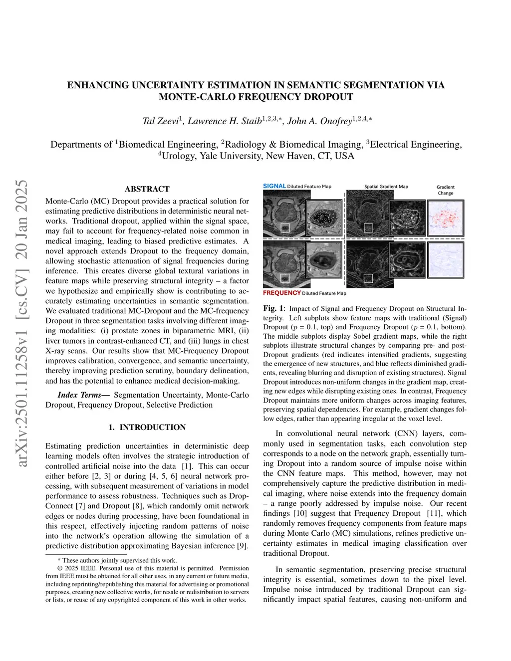 Monte-Carlo (MC) Dropout provides a practical solution for estimating predictive distributions in deterministic neural networks. Traditional dropout, applied within the signal space, may fail to account for frequency-related noise common in medical imaging, leading to biased predictive estimates. A novel approach extends Dropout to the frequency domain, allowing stochastic attenuation of signal frequencies during inference. This creates diverse global textural variations in feature maps while preserving structural integrity -- a factor we hypothesize and empirically show is contributing to accurately estimating uncertainties in semantic segmentation. We evaluated traditional MC-Dropout and the MC-frequency Dropout in three segmentation tasks involving different imaging modalities: (i) prostate zones in biparametric MRI, (ii) liver tumors in contrast-enhanced CT, and (iii) lungs in chest X-ray scans. Our results show that MC-Frequency Dropout improves calibration, convergence, and semantic uncertainty, thereby improving prediction scrutiny, boundary delineation, and has the potential to enhance medical decision-making.